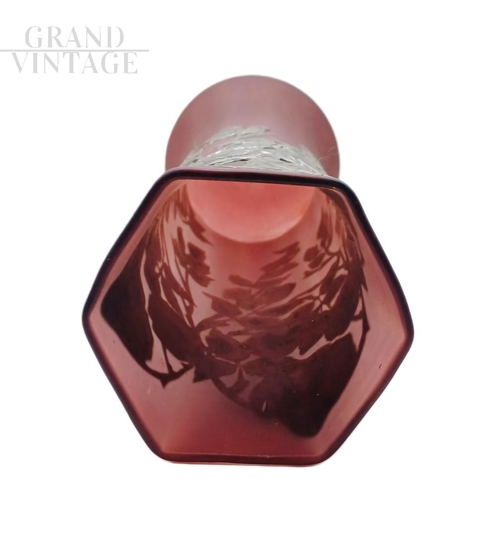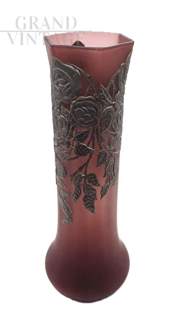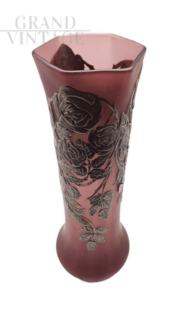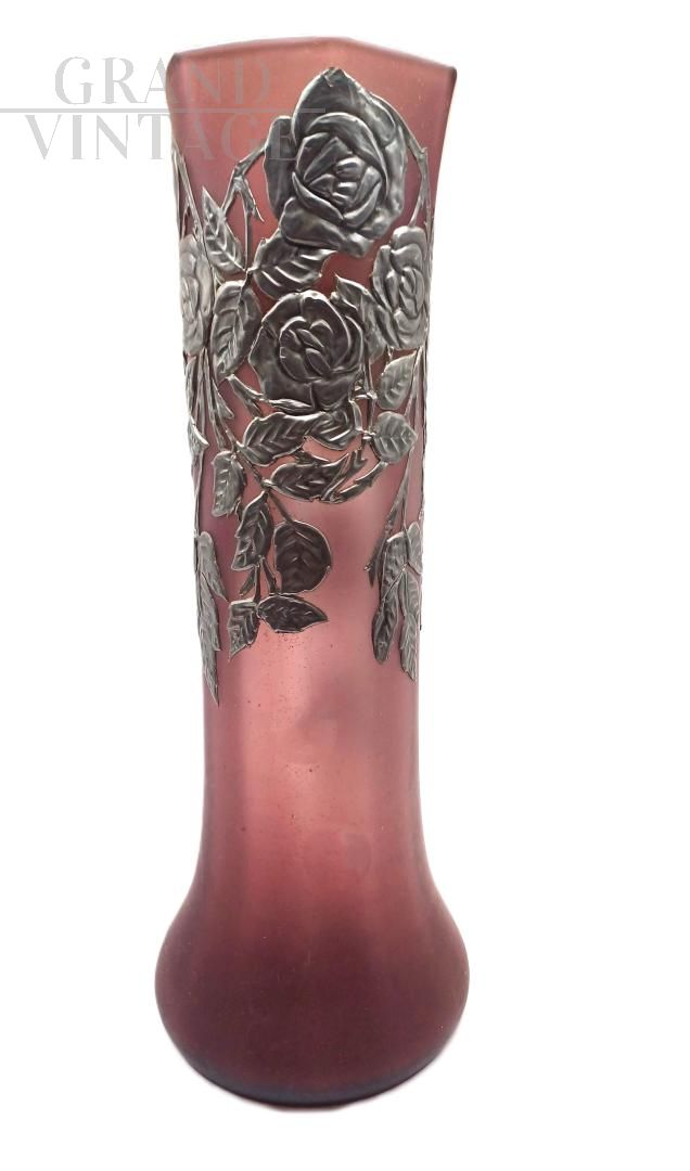 An elegant tubular vase in shaded pink amethyst glass in the Art Nouveau style, dating back to the early 20th century, adorned with refined relief metal decorations (likely silver-plated or pewter) featuring a floral motif depicting roses in full bloom with foliage and branches. The spout has an irregular hexagonal shape with a wavy rim, a bulbous base, and a slender, flared neck. Excellent, original condition.