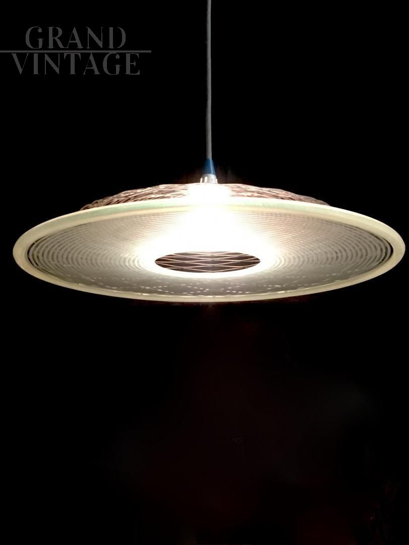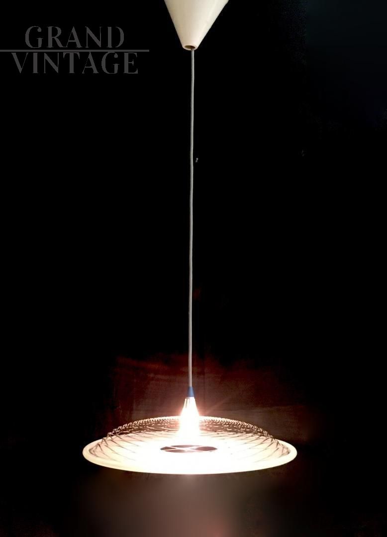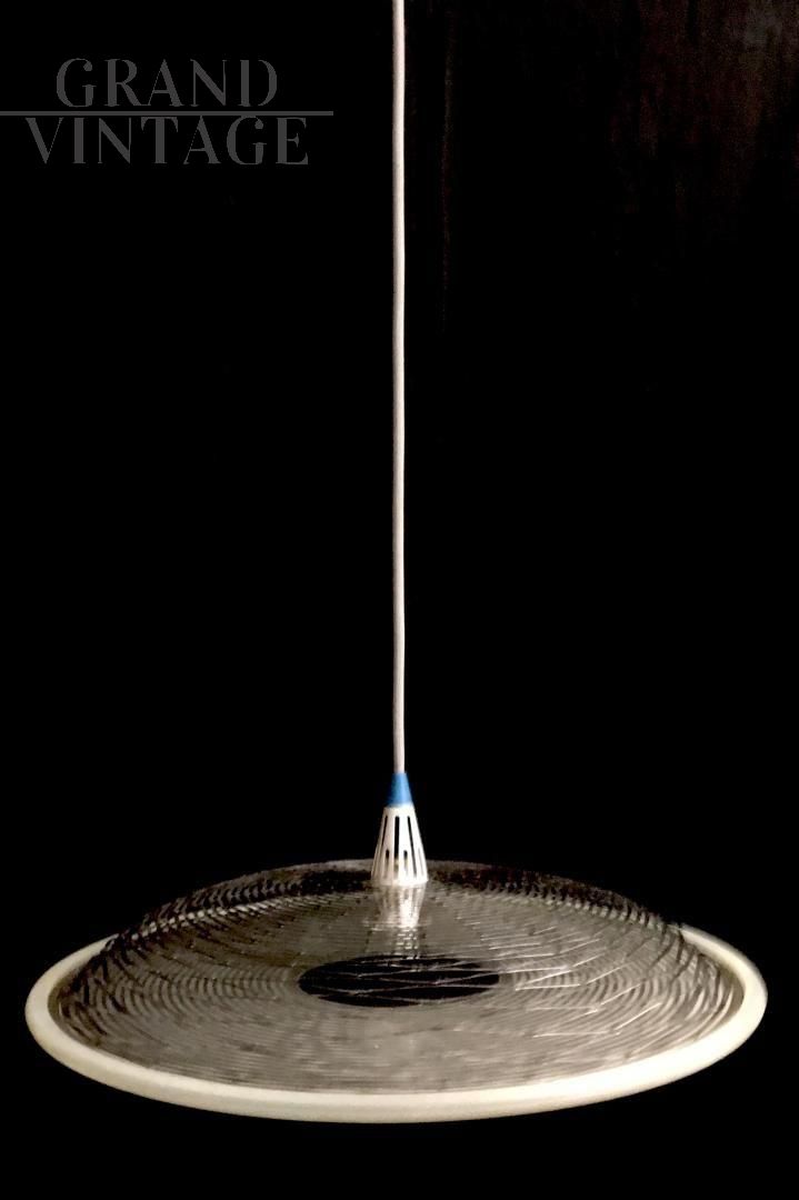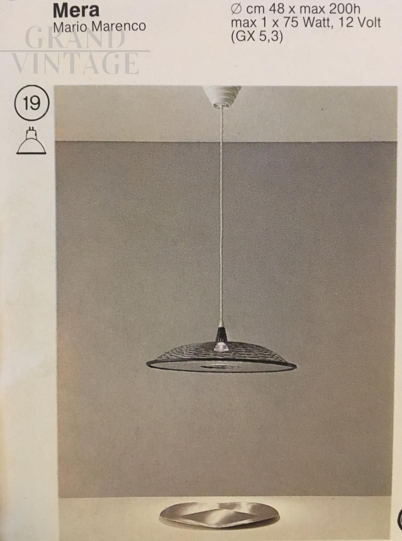 Artemide suspension lamp Mera model, designed by the designer Mario Marenco in the mid-1980s, in good condition. It is all original, it only has some signs of aging; Fantastic glass not cracked, original and working electrical system. The wire mesh is also in good condition. Used for a limited time and kept with care. The transformer is in the top cup and has a 24V bulb. If you want you can put a led bulb. Excellent lightning for different rooms: from the kitchen to the living room, from an entrance to a bedroom or a bathroom.