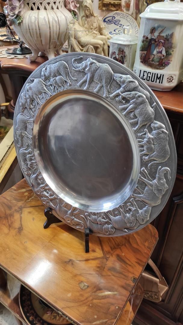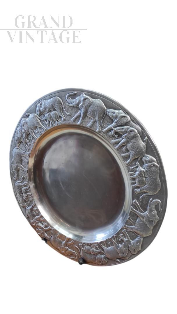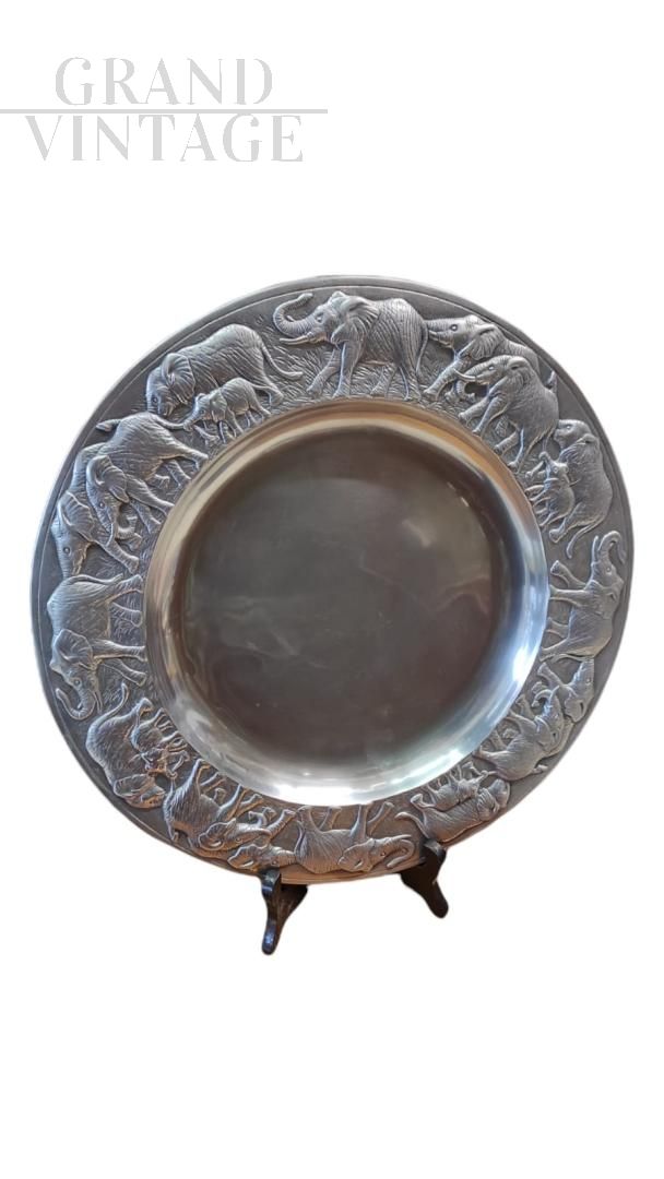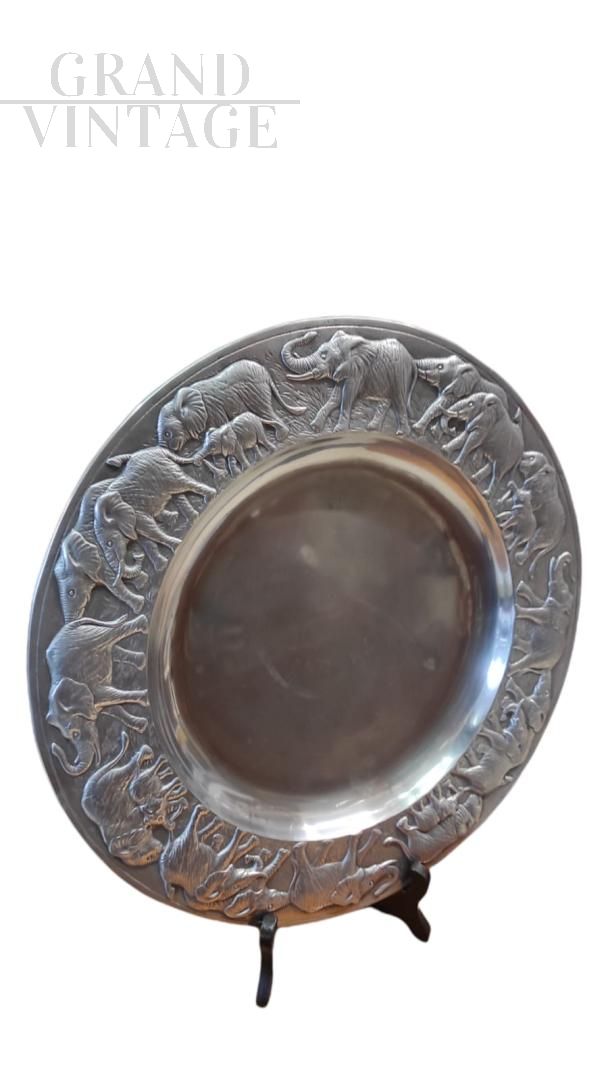 Decorative serving tray in aluminum alloy with pleasant double-sided ethnic decorations with embossed elephants and pretty engravings, the signature of the author Arthur Court and the year of production 1987 are clearly visible. A beautiful decorative object that can also be used as a plate for buffets and appetizers or as a tray or centerpiece.