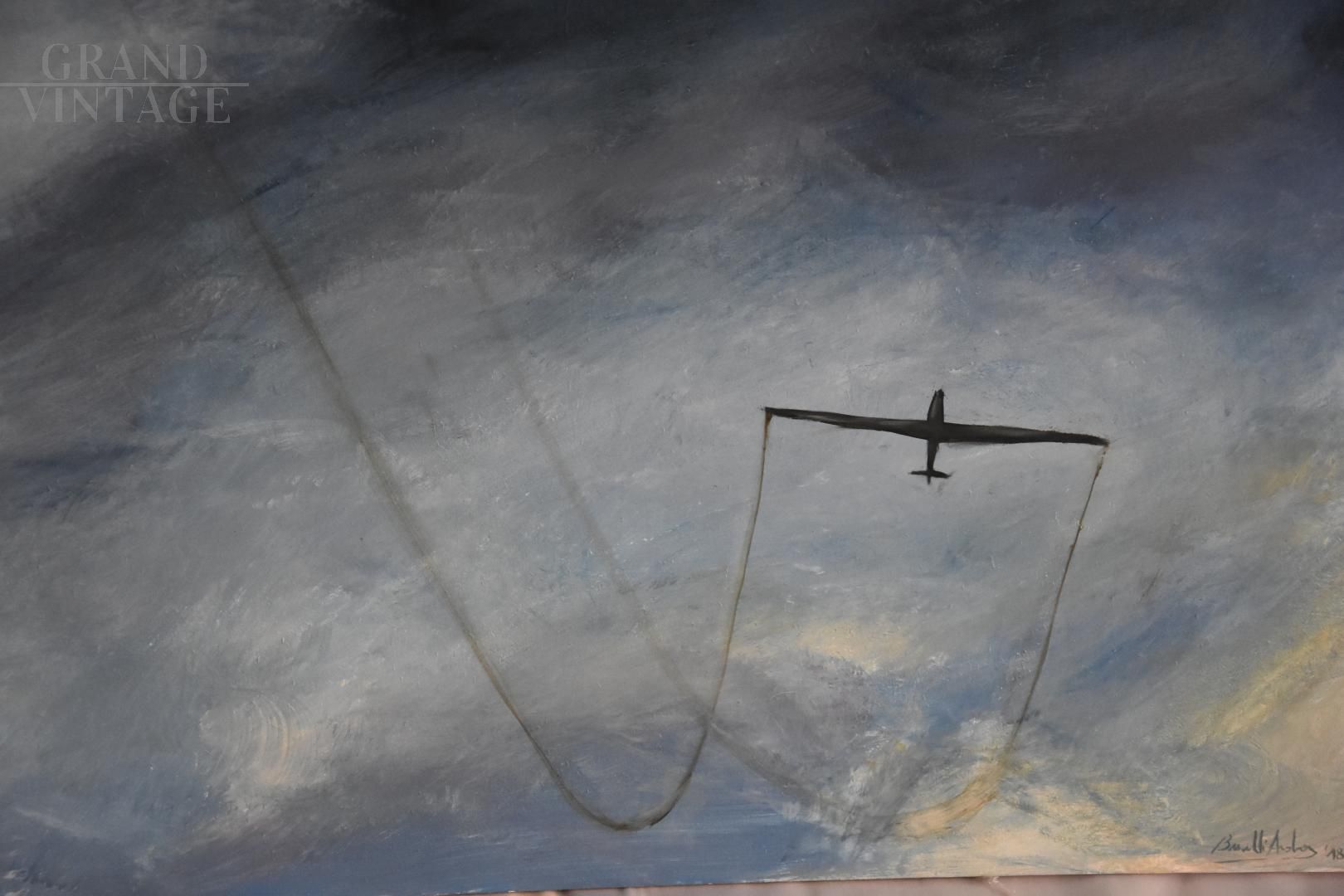 Ascent - Painting by the Italian Lombard artist Andrea Busnelli (1989) made in oil on wood, depicting an airplane hovering in the night sky; in the background of this artwork the moon appears timidly, witnessing a path made up of fluid and dynamic ascents and descents, the result of the artist's life experiences. Painting with certificate of originality signed by the artist.