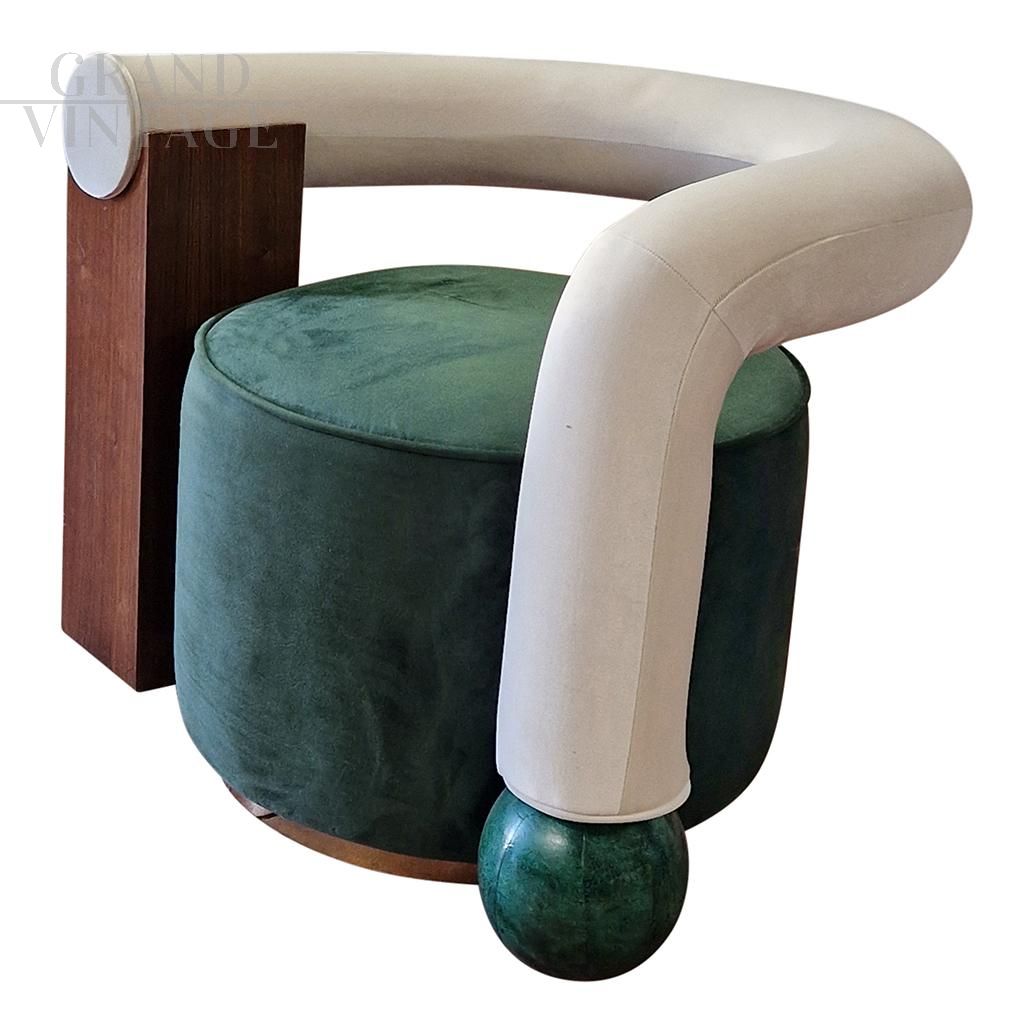 Asymmetric design armchair with geometric elements composed of a round pouf ottoman in dark green velvet with a curved padded backrest covered with white fabric, one leg is made up of a rectangular column in dark wood, the other leg ends with a dark green lacquered wooden sphere . The base is enriched by a round brass plinth.