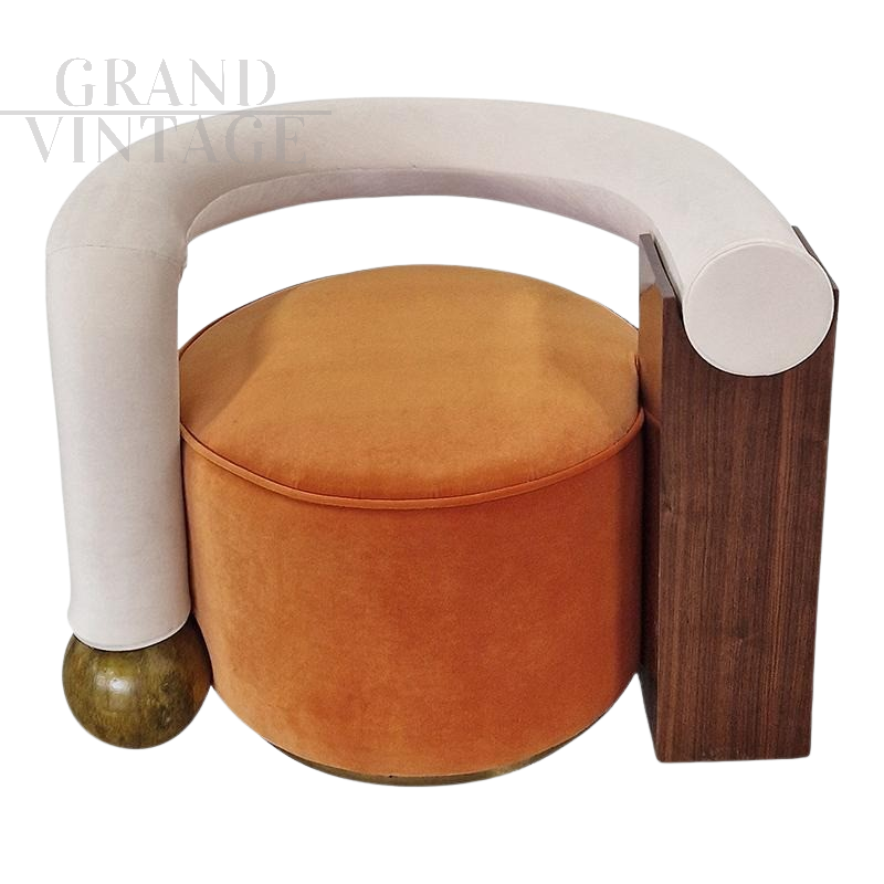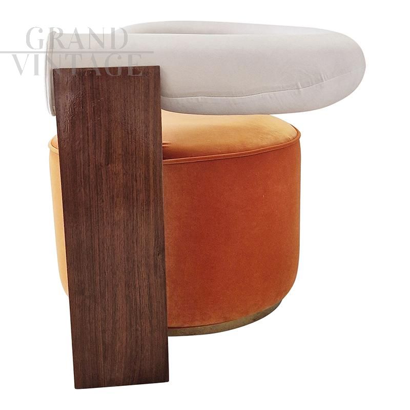 Geometric design armchair composed of an orange velvet ottoman seat and a white curved backrest with dark wood column support. Note the lacquered wooden sphere, geometric detail. The base of the seat is enriched by a round brass skirting board.