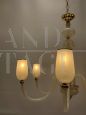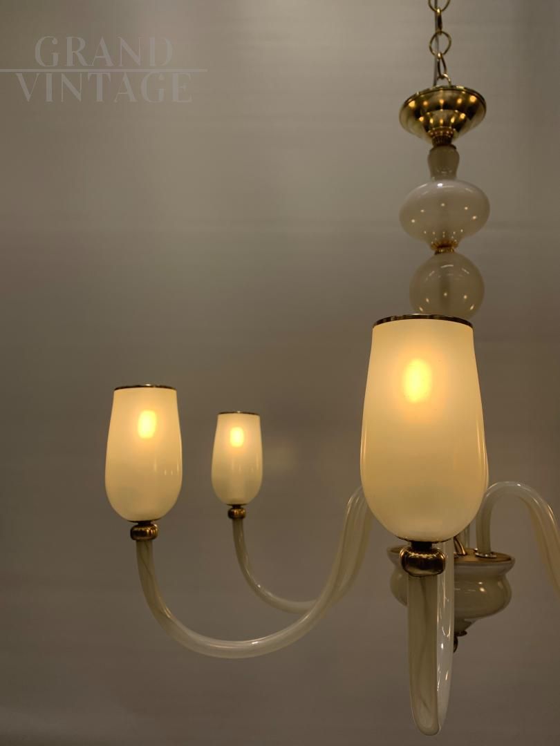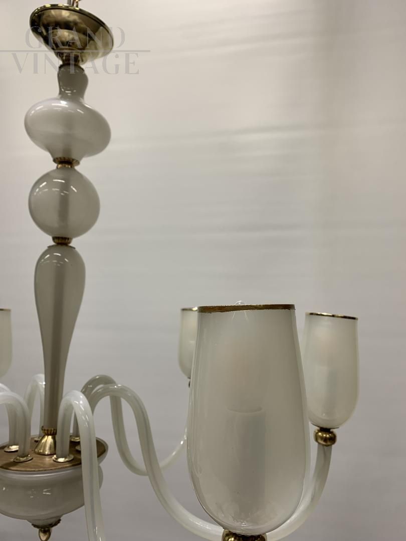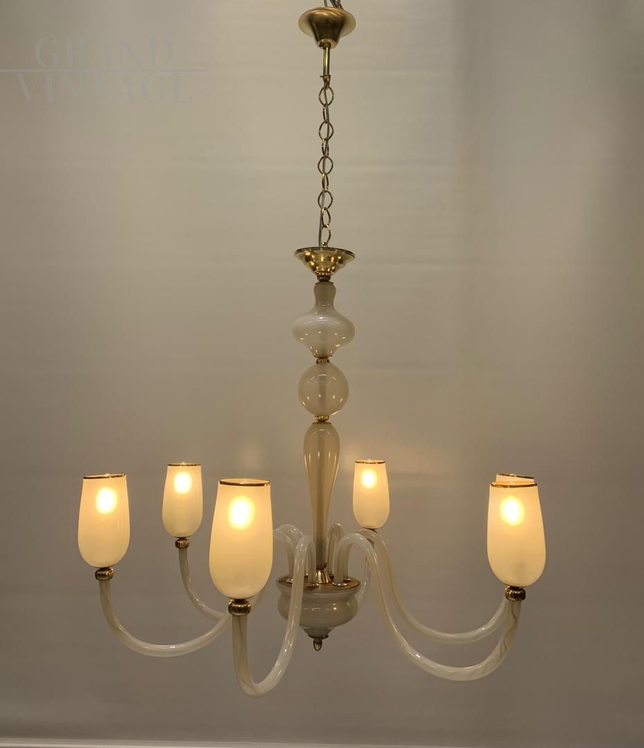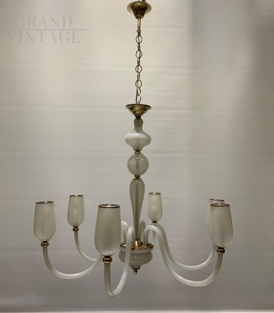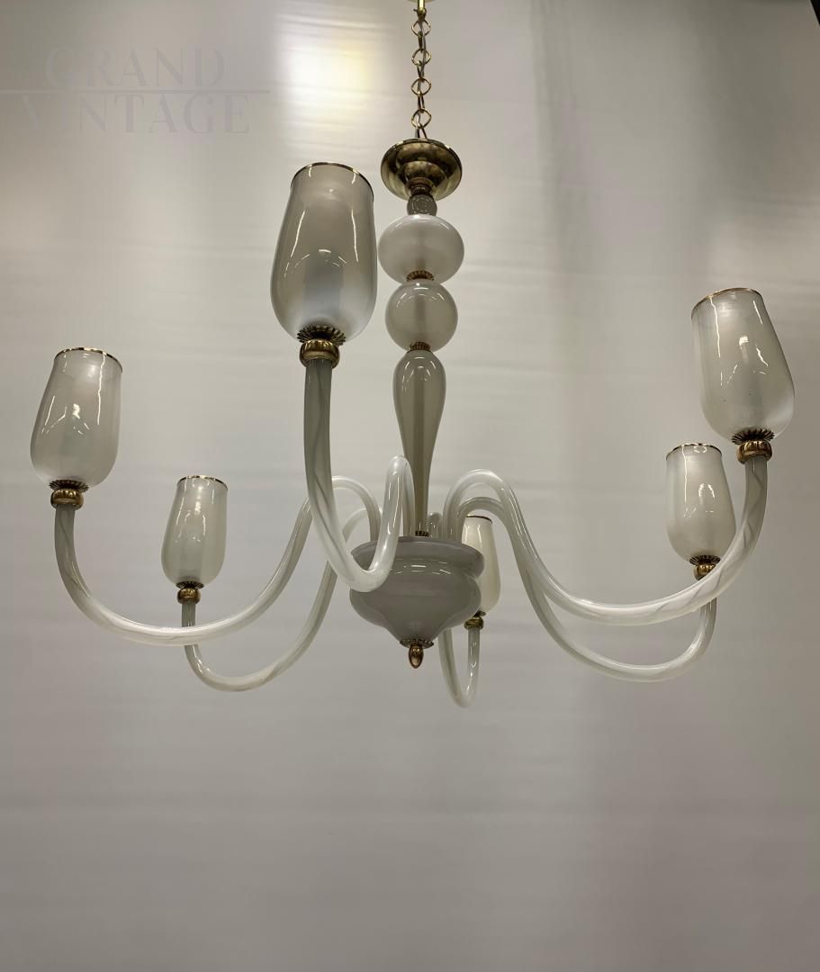 Fantastic chandelier from the 1960s in fair condition attributed to the Seguso company. It is all original, has very few signs of aging, fantastic glass, redone and working electrical system. Wonderful transparent hand-blown glass, sandblasted. The chandelier presented is an elegant piece of design, characterized by a harmony of shapes. Made of opaque white glass, it has six arms that curve delicately outwards, each equipped with an opening for the light. The central part is accentuated by a spherical shape that gives a touch of refinement.