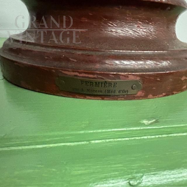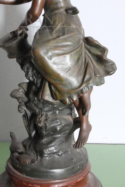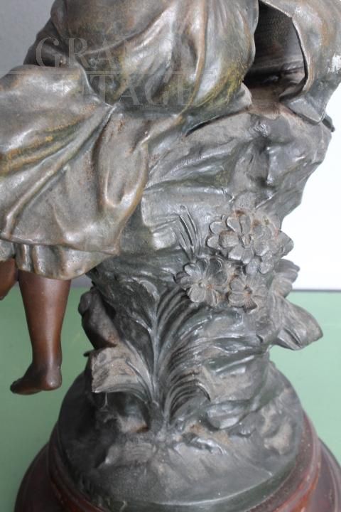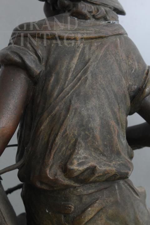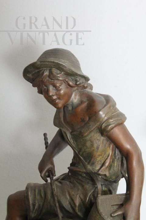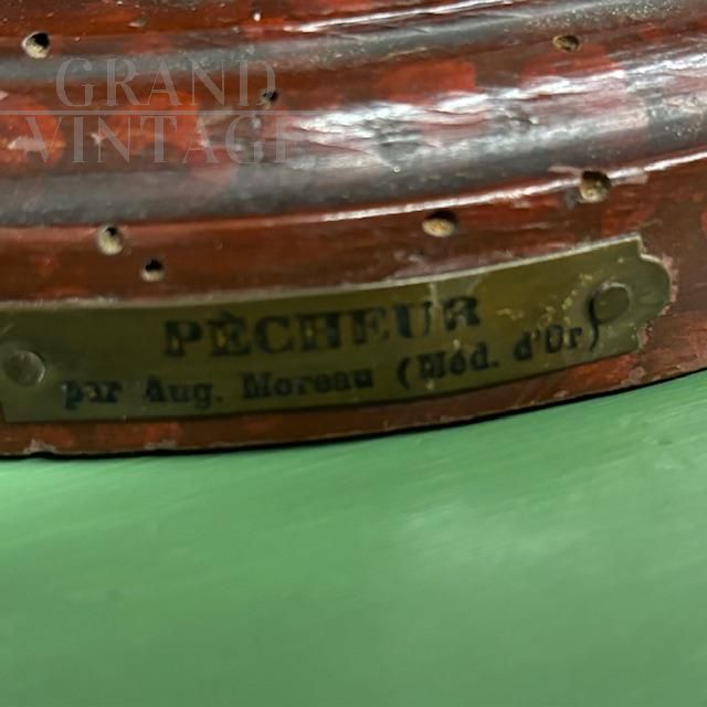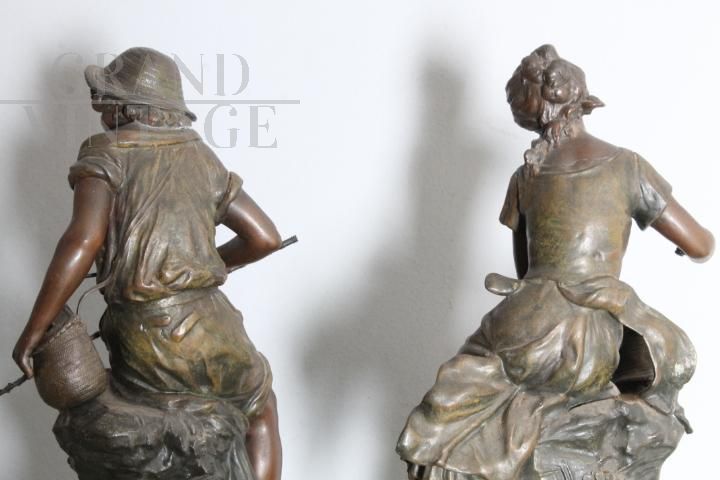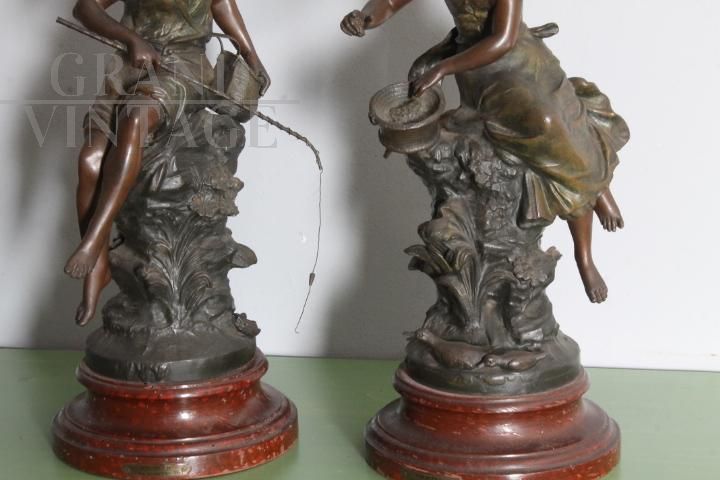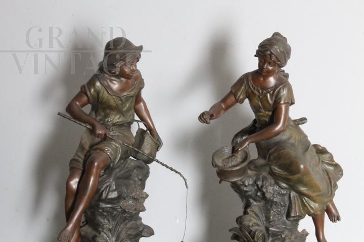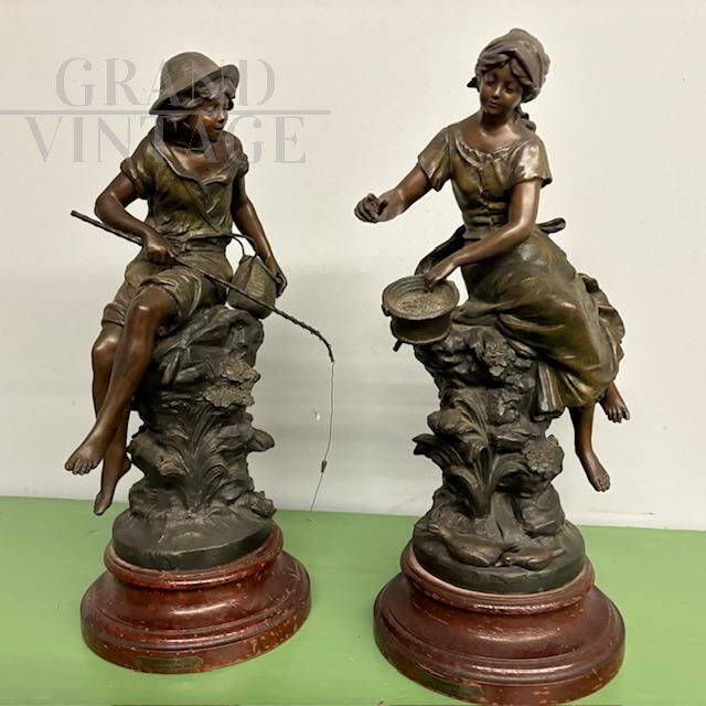 Pair of antique sculptures signed Auguste Moreau from the late 19th century, Liberty period, in patinated antimony on a sculpted wooden base, of beautiful quality, depicting a fisherman and a peasant woman, signed on the base.