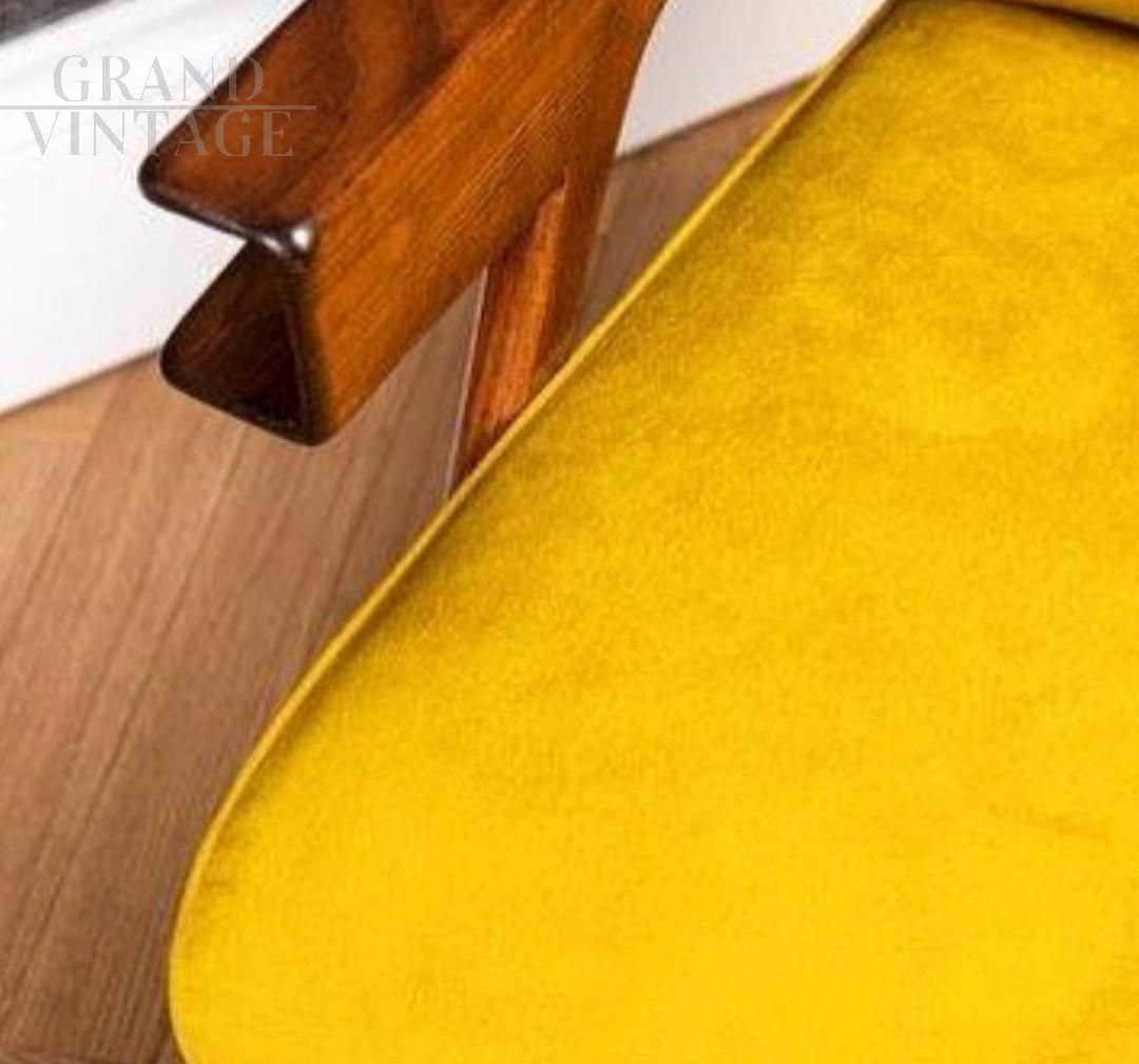 Augusto Romano, pair of design armchairs with footrest in saffron yellow velvet with structure in walnut wood.