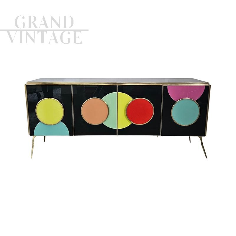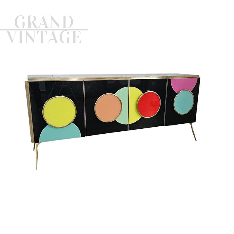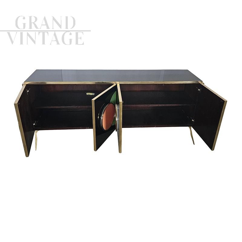 Four-door sideboard with internal shelf, entirely handmade, with wooden structure covered in black glass. Profiles and feet in gold-plated brass. Round colored handles backlit with LEDs.