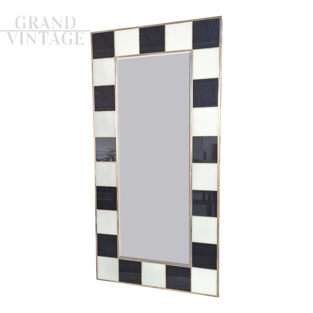 Large mirror with wooden structure and surface finishes in black and white glass tiles, backlit, entirely handmade, with golden brass profiles.