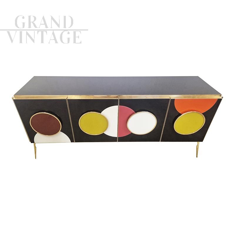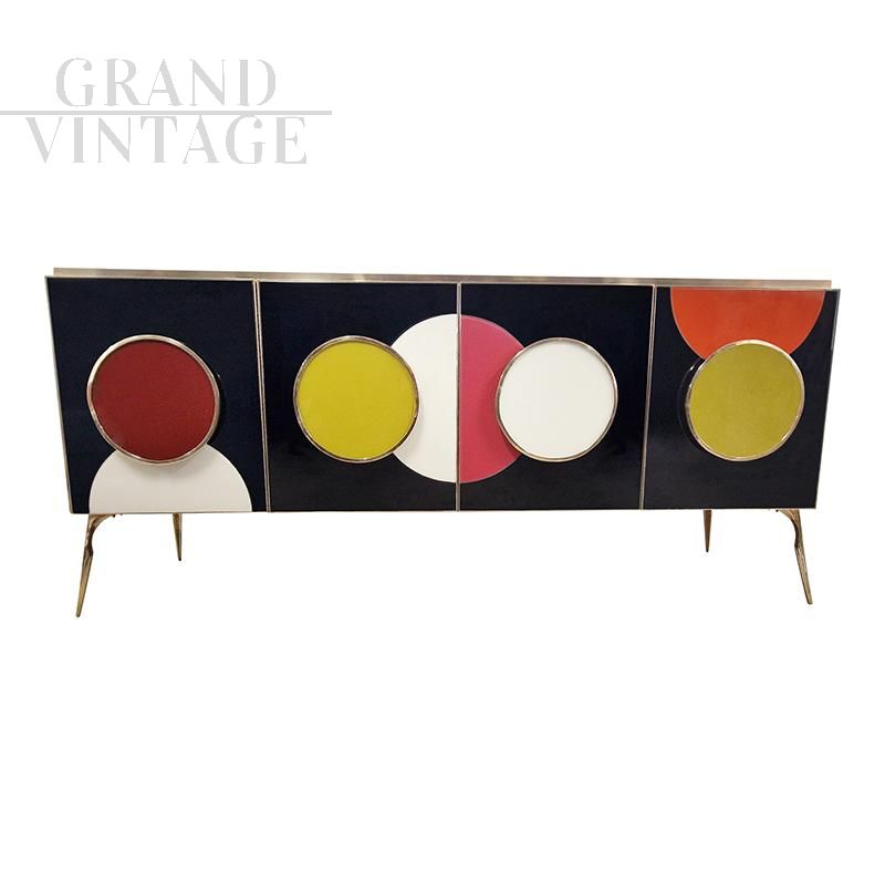 Four-door design sideboard with internal shelf, entirely handmade, with wooden structure covered in black glass. Profiles and feet in golden brass. LED backlit colored round handles.