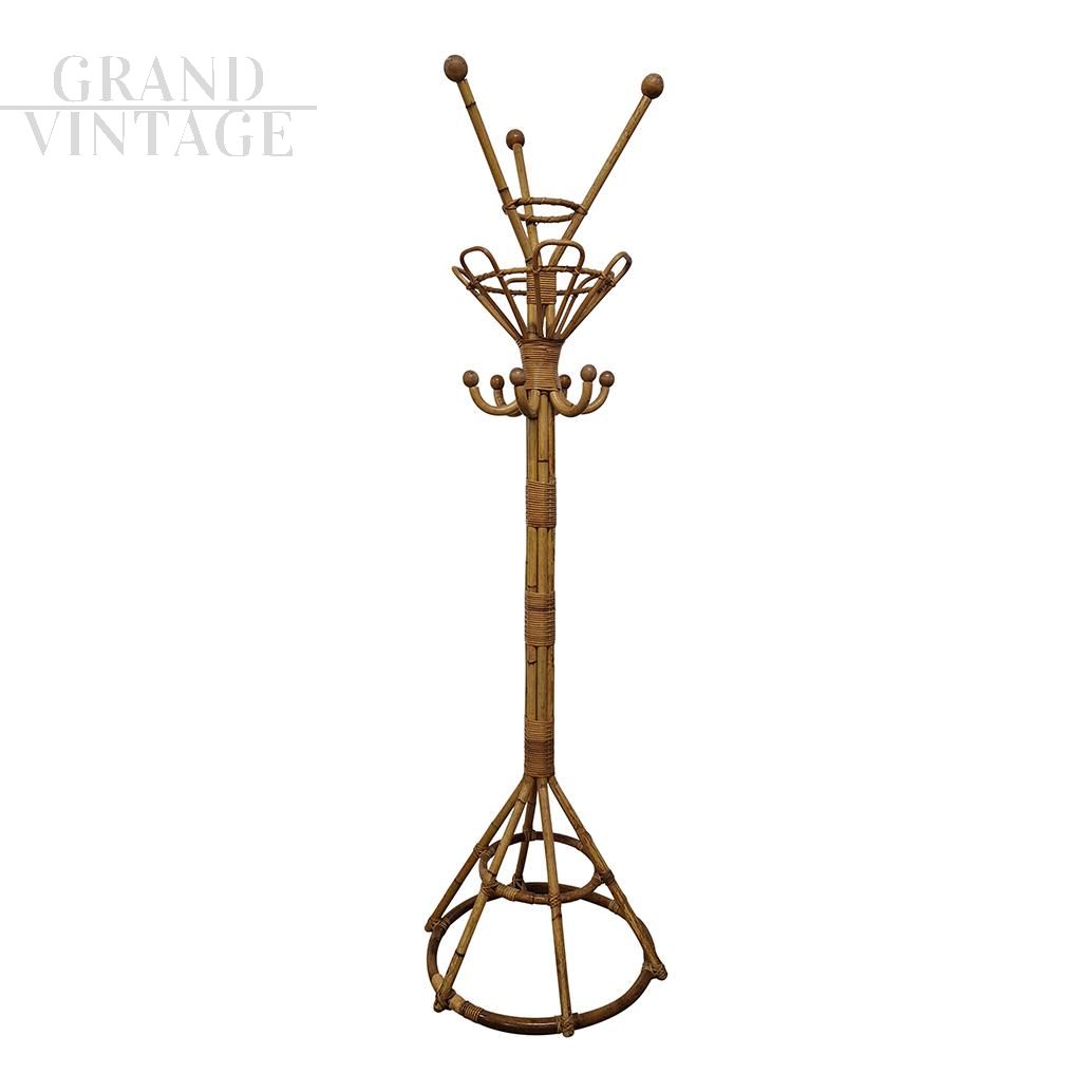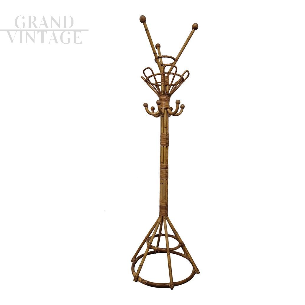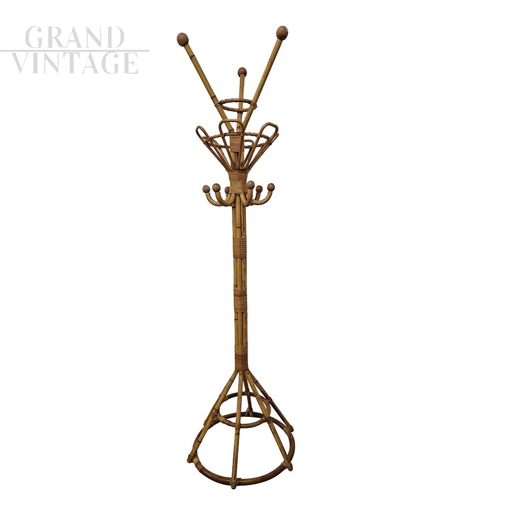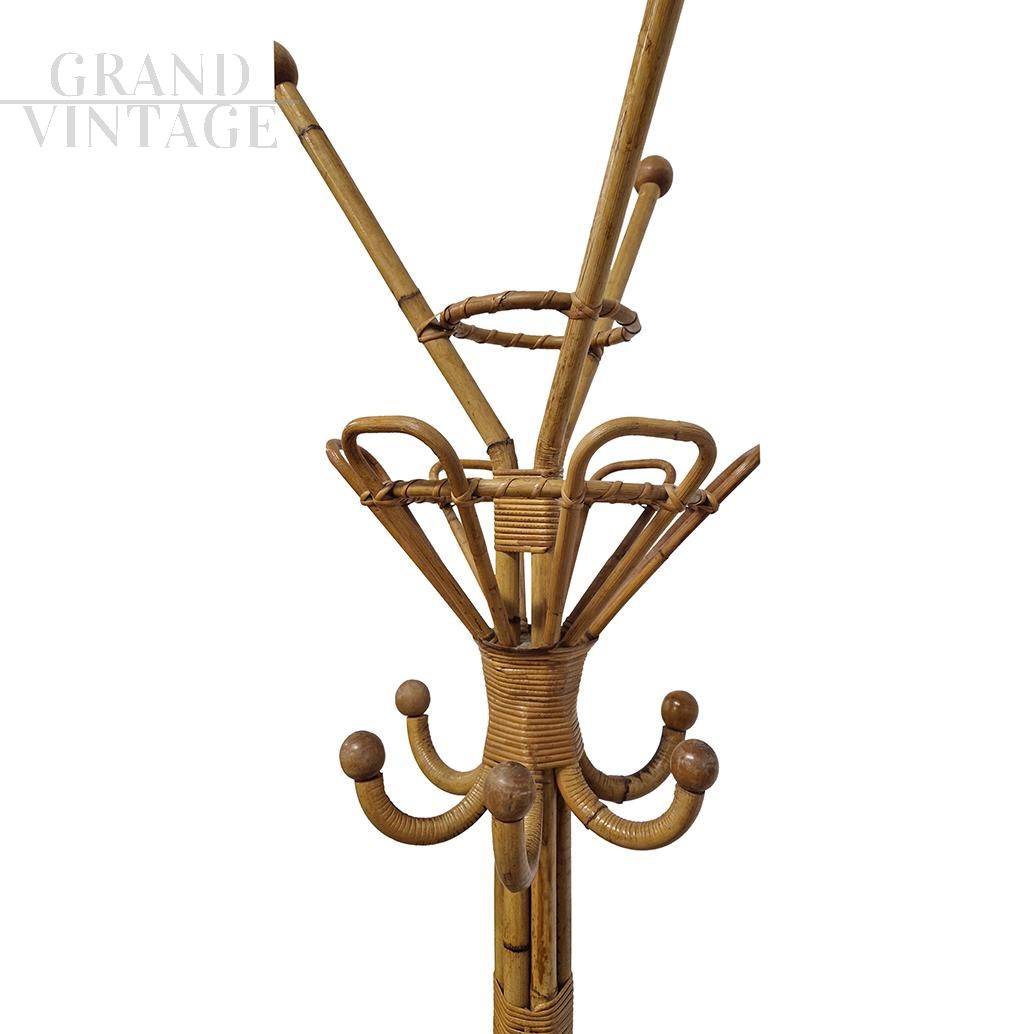 Coat hanger in bamboo and rattan with three high rods finished with bamboo balls and six lower hooks.