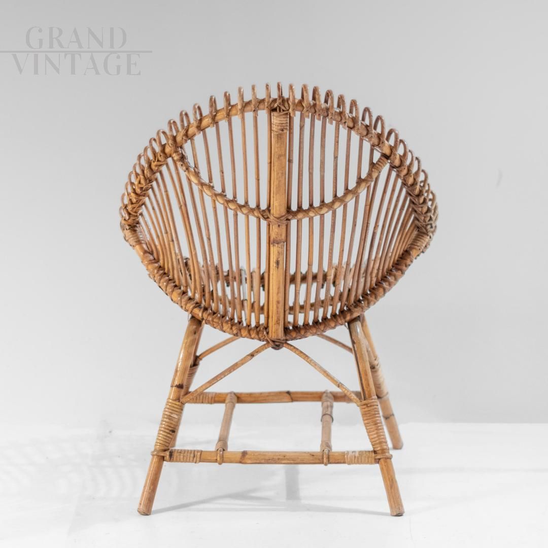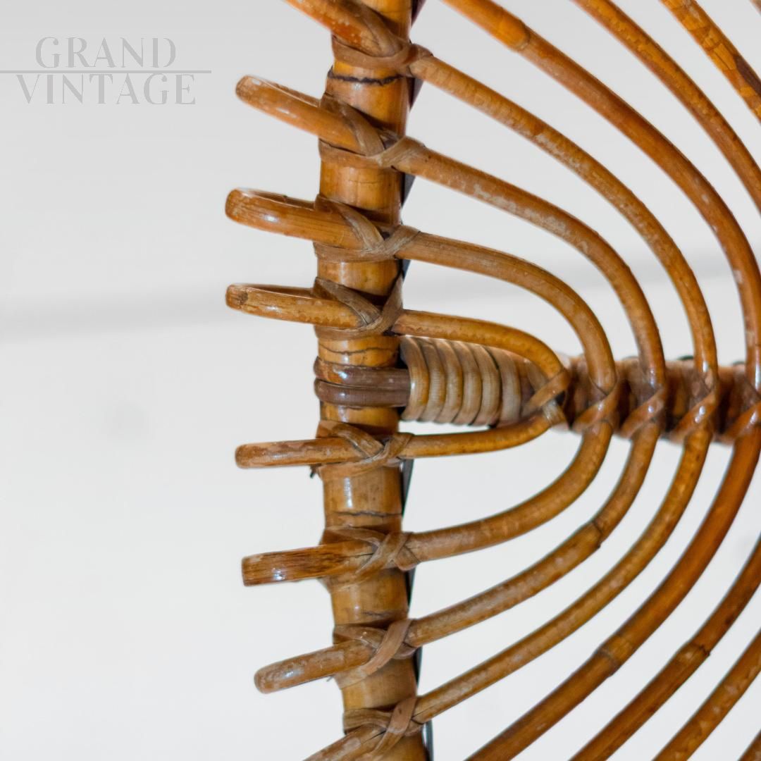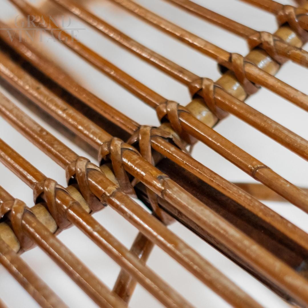 A beautifully crafted bamboo lounge or garden set in Italy from the 1960s. It includes a low armchair and a matching coffee table, both showcasing the elegance and versatility of handcrafted bamboo. The armchair features an open, sculptural design, with elegantly curved bamboo slats arranged in a fan shape, offering comfort and visual lightness. The matching table features a woven circular top and dynamic X-shaped legs, demonstrating the refined craftsmanship and attention to detail typical of mid-century Italian design. Recently refinished, the set is in excellent condition, undamaged, and ready to enhance both indoor and covered outdoor spaces.