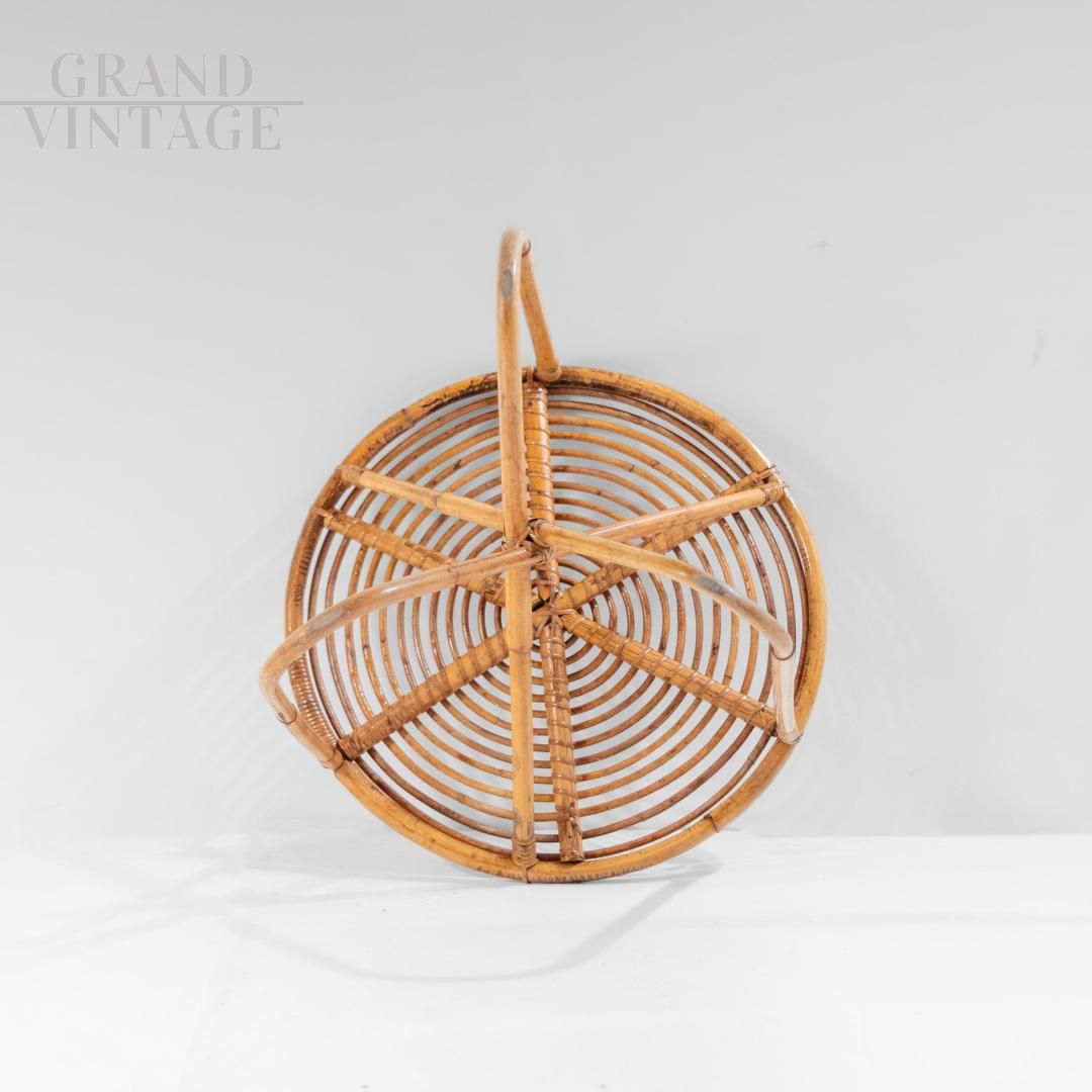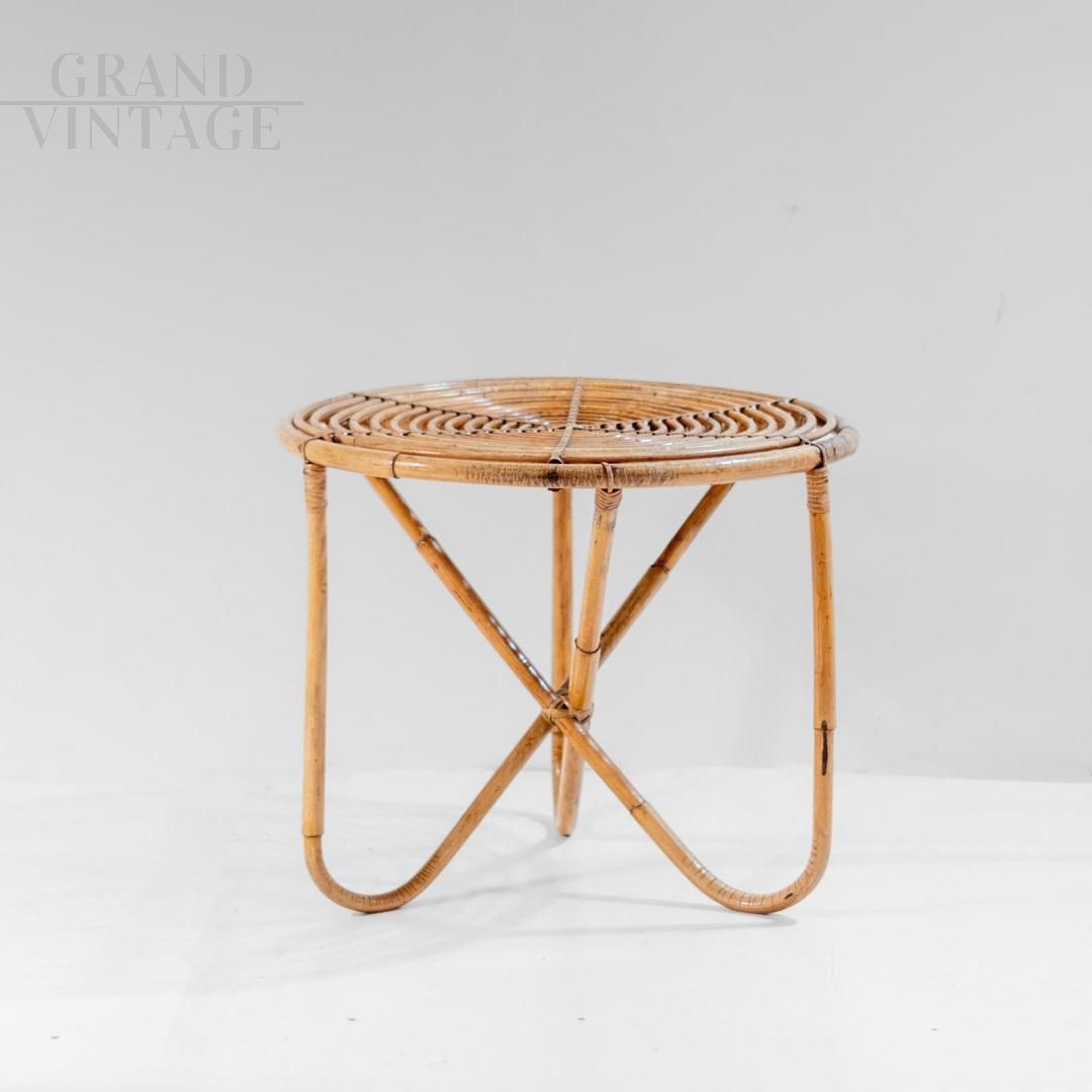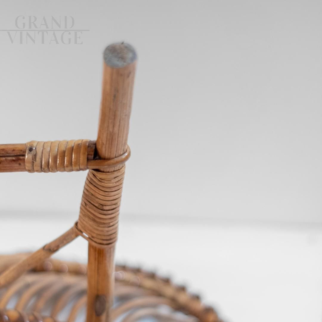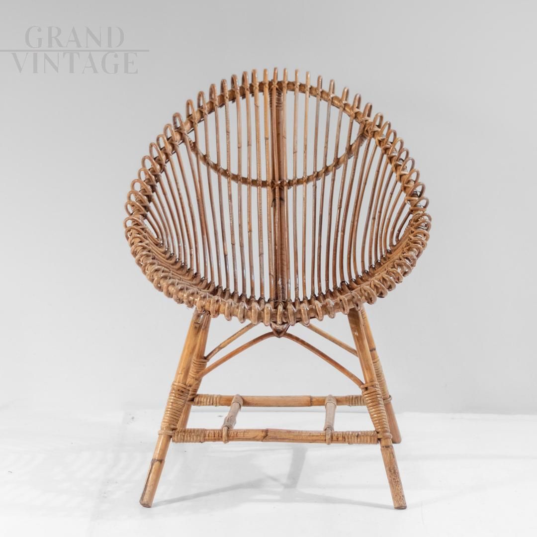 A beautifully crafted bamboo lounge or garden set in Italy from the 1960s. It includes a low armchair and a matching coffee table, both showcasing the elegance and versatility of handcrafted bamboo. The armchair features an open, sculptural design, with elegantly curved bamboo slats arranged in a fan shape, offering comfort and visual lightness. The matching table features a woven circular top and dynamic X-shaped legs, demonstrating the refined craftsmanship and attention to detail typical of mid-century Italian design. Recently refinished, the set is in excellent condition, undamaged, and ready to enhance both indoor and covered outdoor spaces.