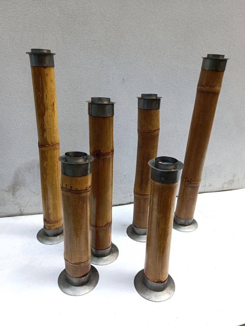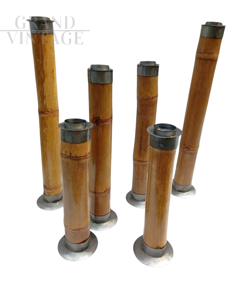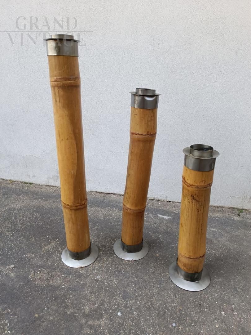 Vintage bamboo floor candlesticks in three different sizes, composed of large bamboo trunks with metal terminals. Suitable for both indoor and outdoor furnishings, they can also be sold in pairs of the same size or in sets of 3 in different sizes. The price indicated is for each single candlestick.