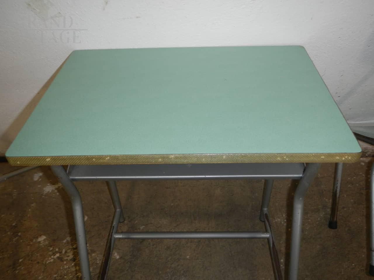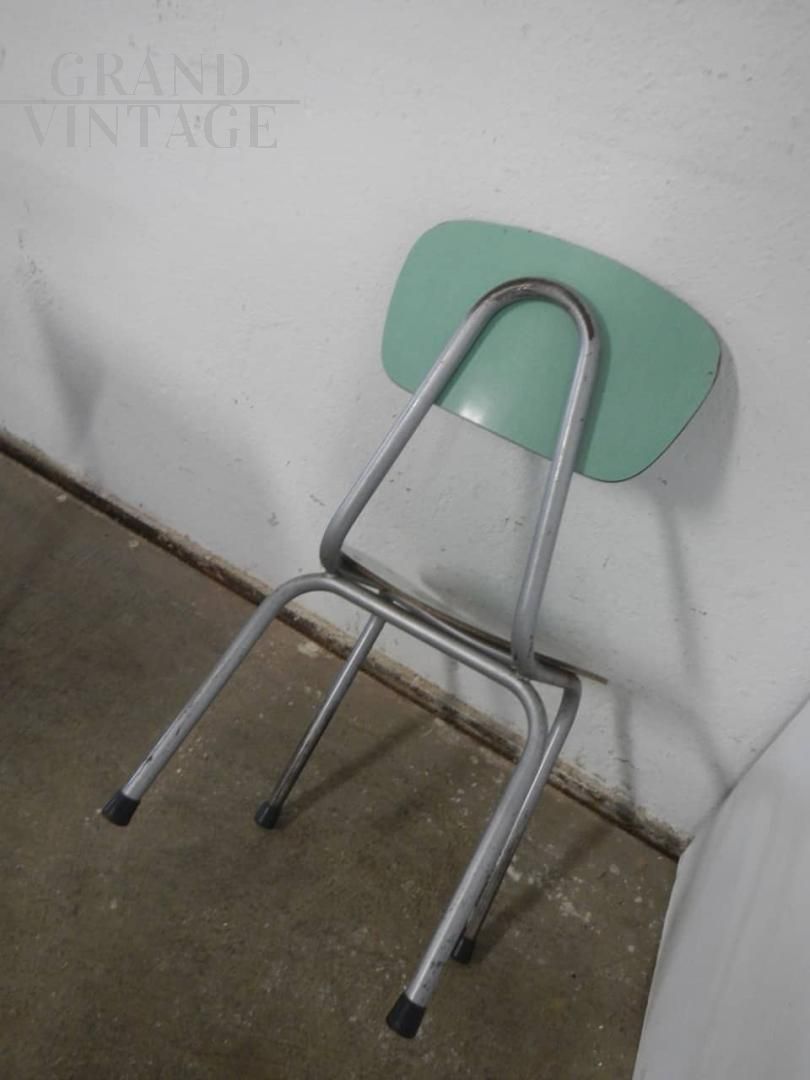 Small vintage school desk in green formica with chair, used in kindergartens. It has some imperfections due to use. The structure is good. The chair measures 29 x 28 cm, height 61 cm, seat height 33 cm.