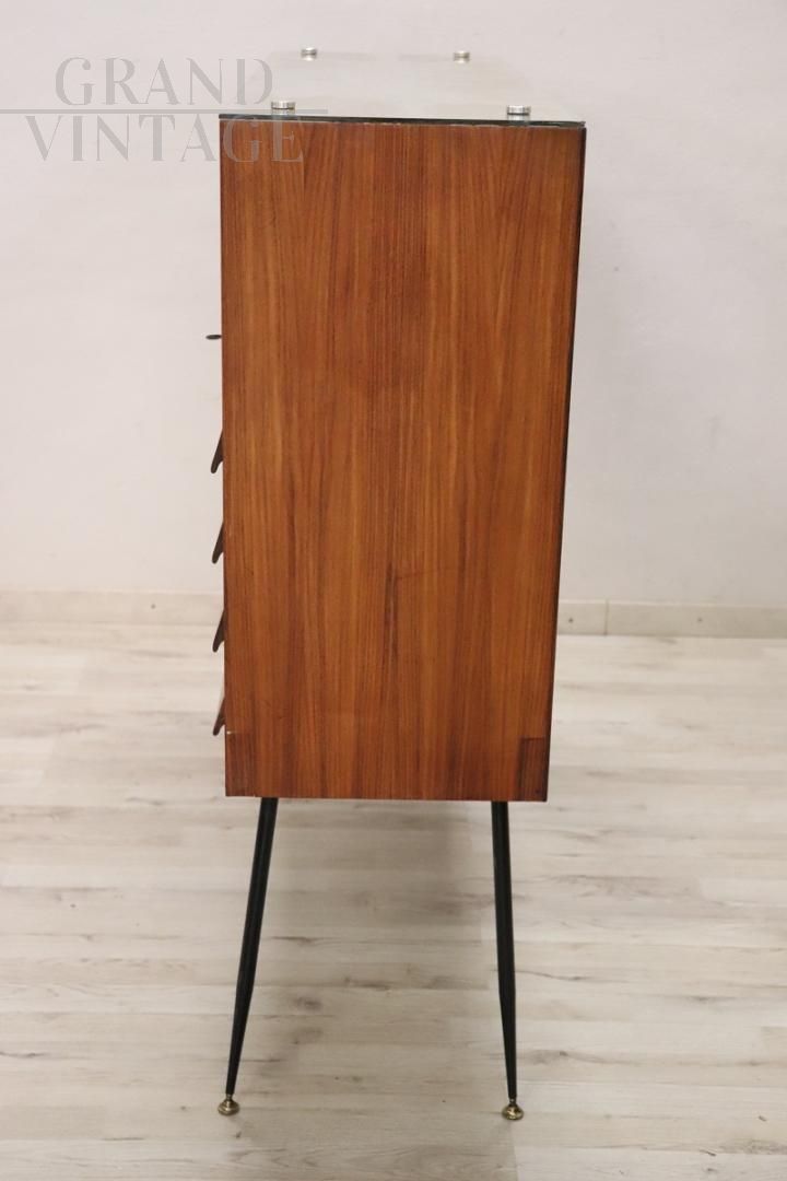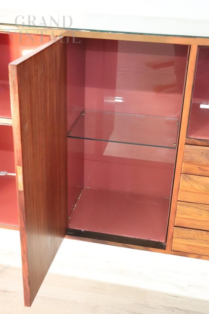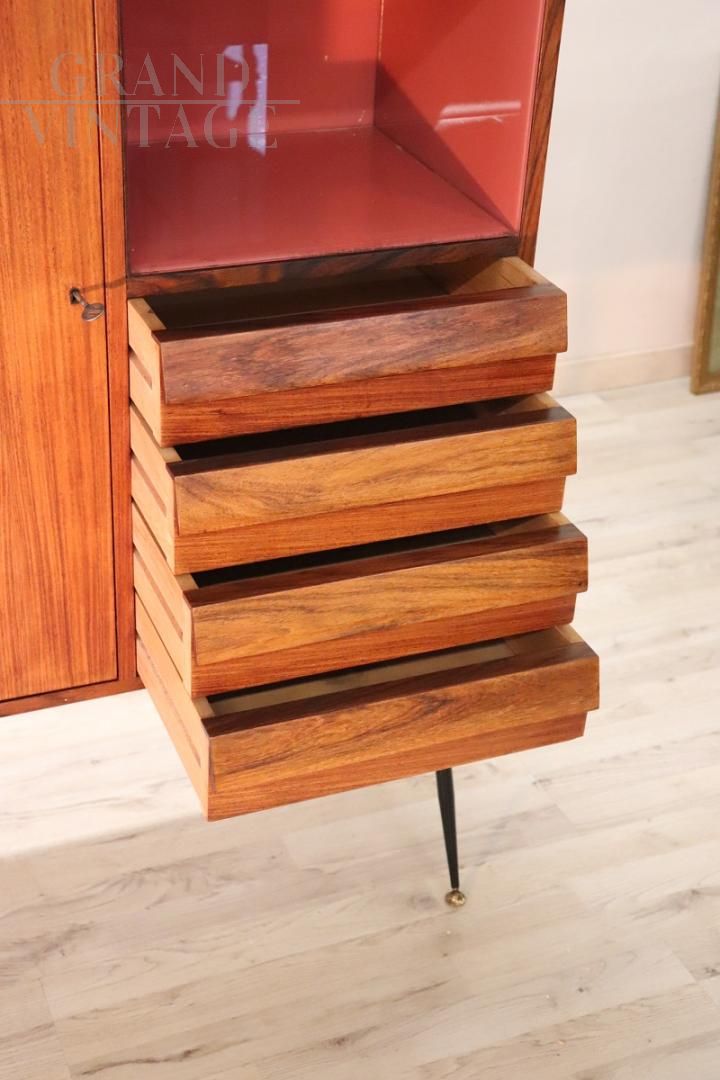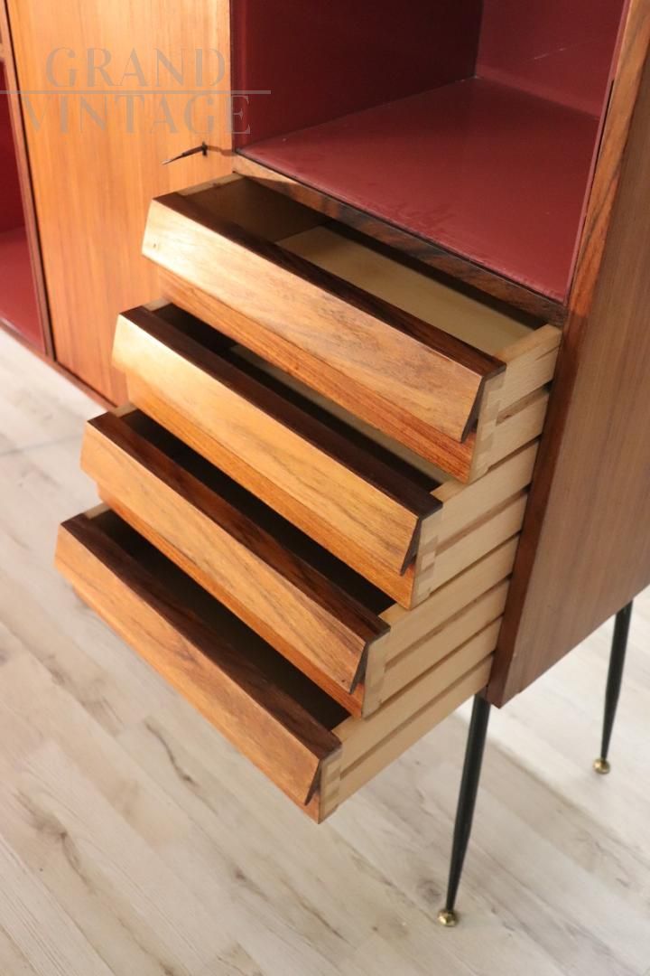 Beautiful and rare Italian design bar cabinet from the 1960s, made of fine rosewood wood. This rare bar cabinet was made to be placed in the center of the room. On the front it is only decorative, with a large central mirror, on the back it is equipped with numerous compartments and drawers to hold bottles and bar accessories. Note the details, each internal part is covered in glass to avoid any stains and facilitate the use of the bar compartment. The gold-decorated upper surface is covered in glass. The long legs are in black lacquered metal, typical of the sixties. In excellent condition, there are two small defects on the upper surface. Perfect for a modern environment. Price negotiable.