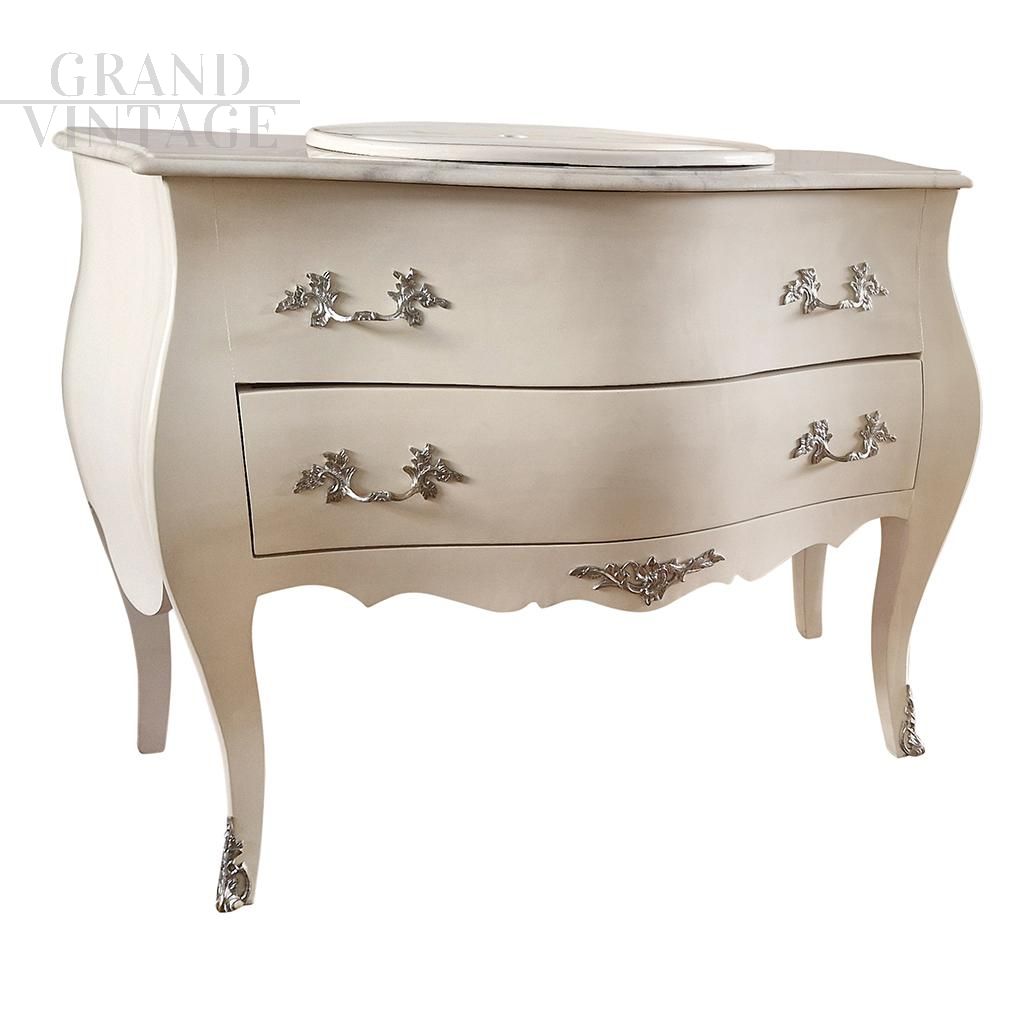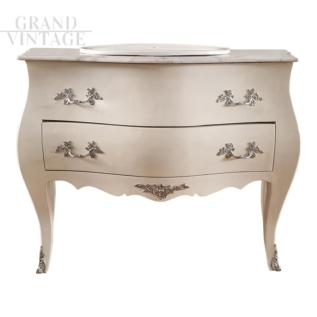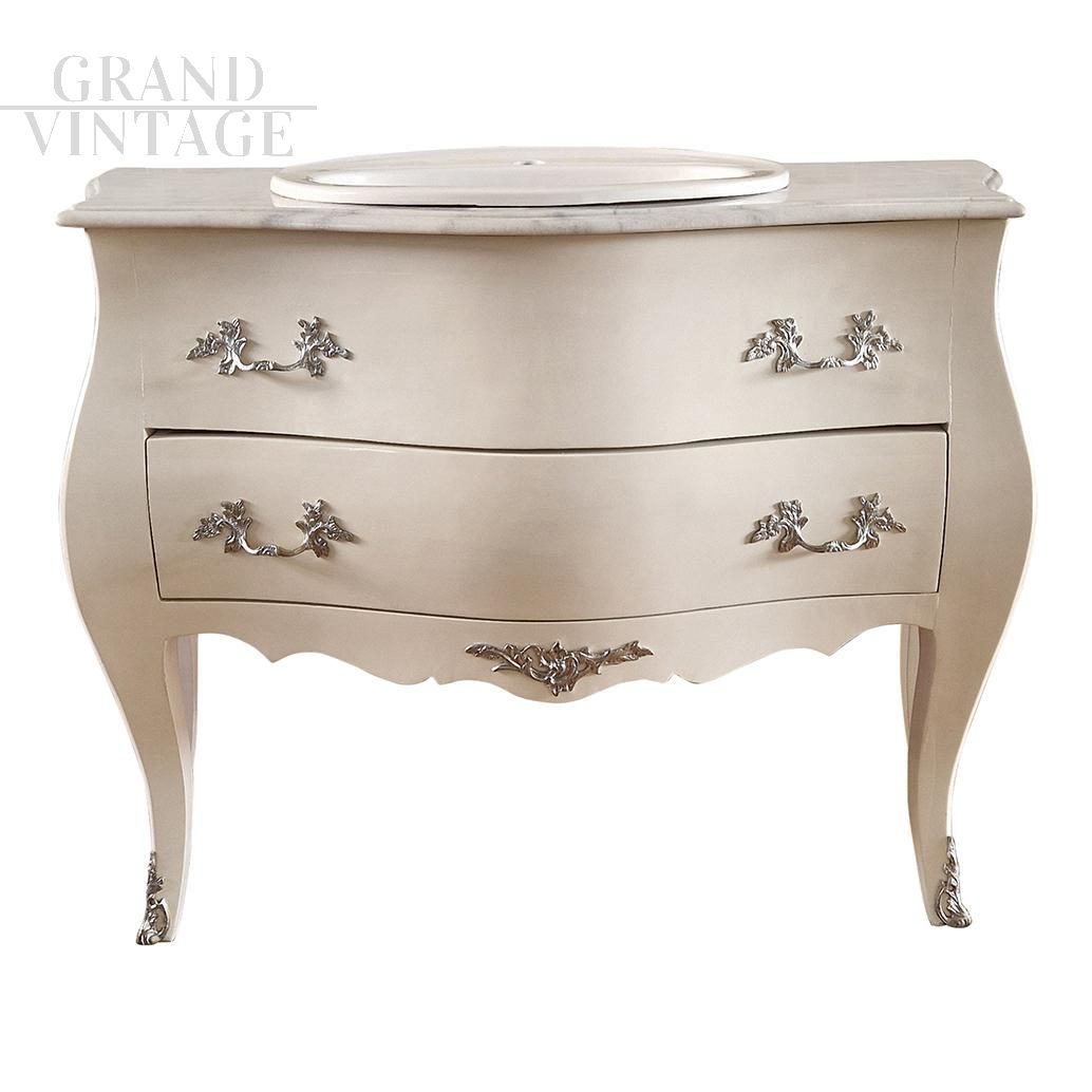 Antique Baroque style bathroom vanity unit with a splendid wavy shape on the front and sides, made of ivory lacquered wood enriched with silver metal decorations and handles, complete with marble top and ceramic sink bowl.