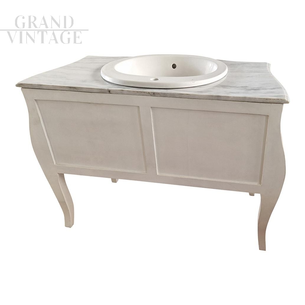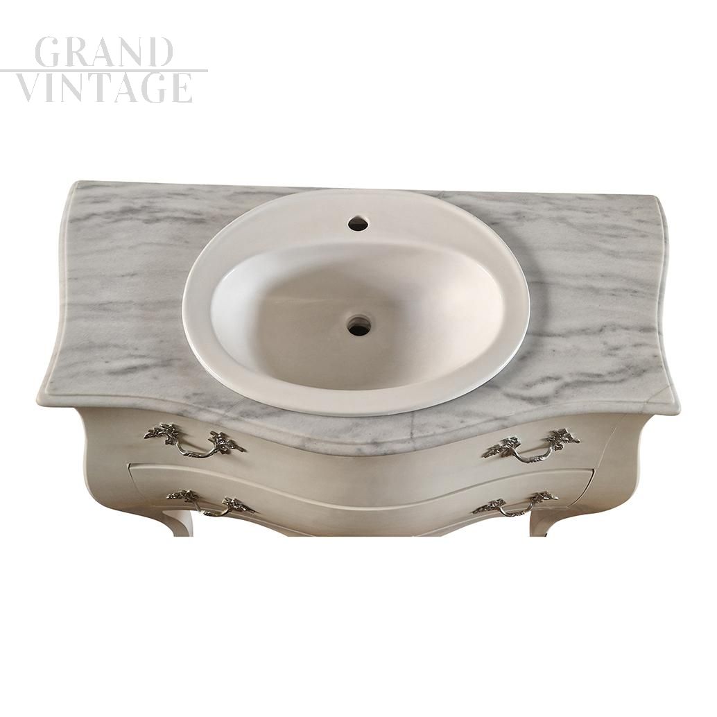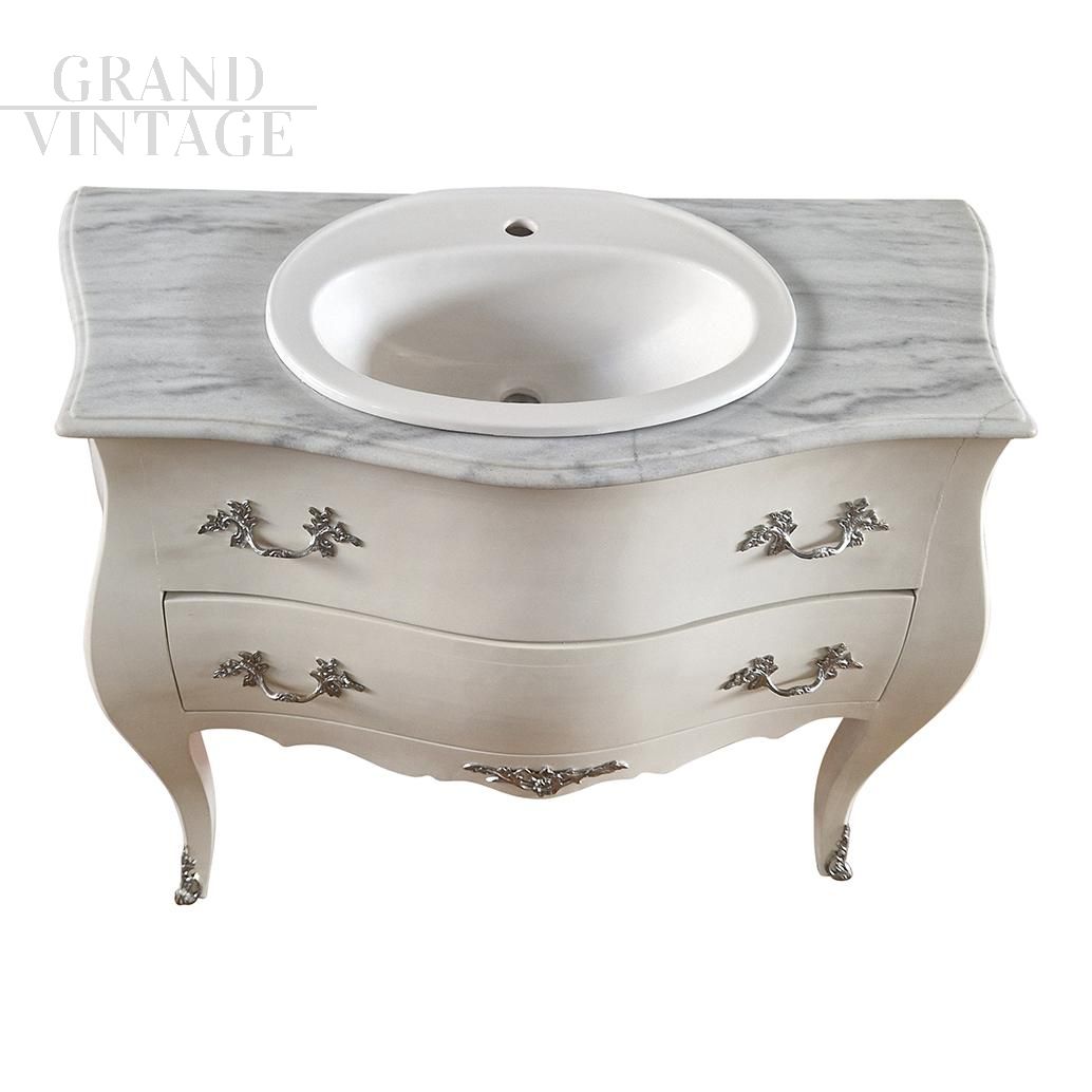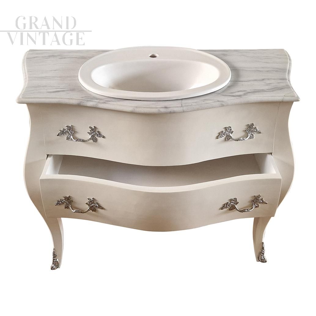 Antique Baroque style bathroom vanity unit with a splendid wavy shape on the front and sides, made of ivory lacquered wood enriched with silver metal decorations and handles, complete with marble top and ceramic sink bowl.