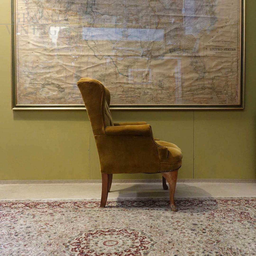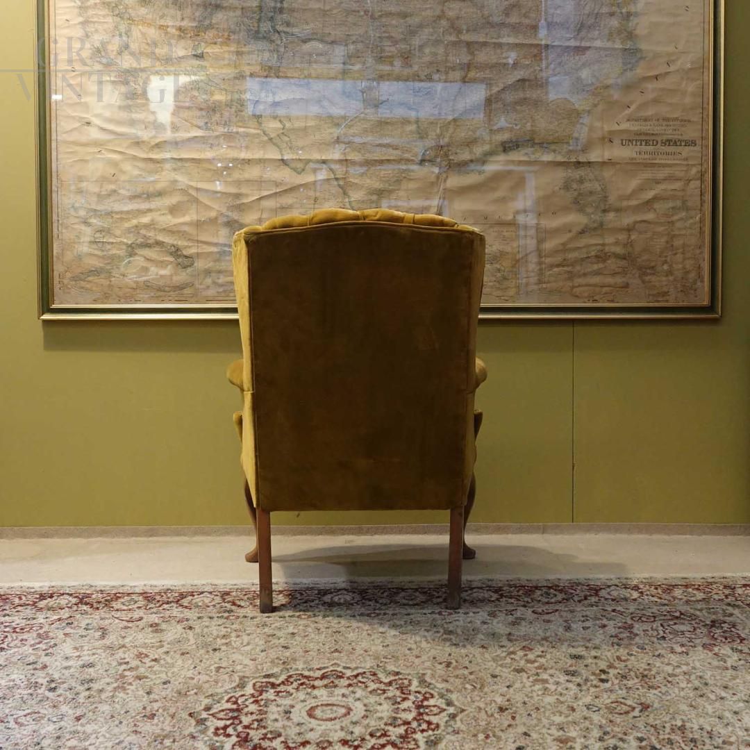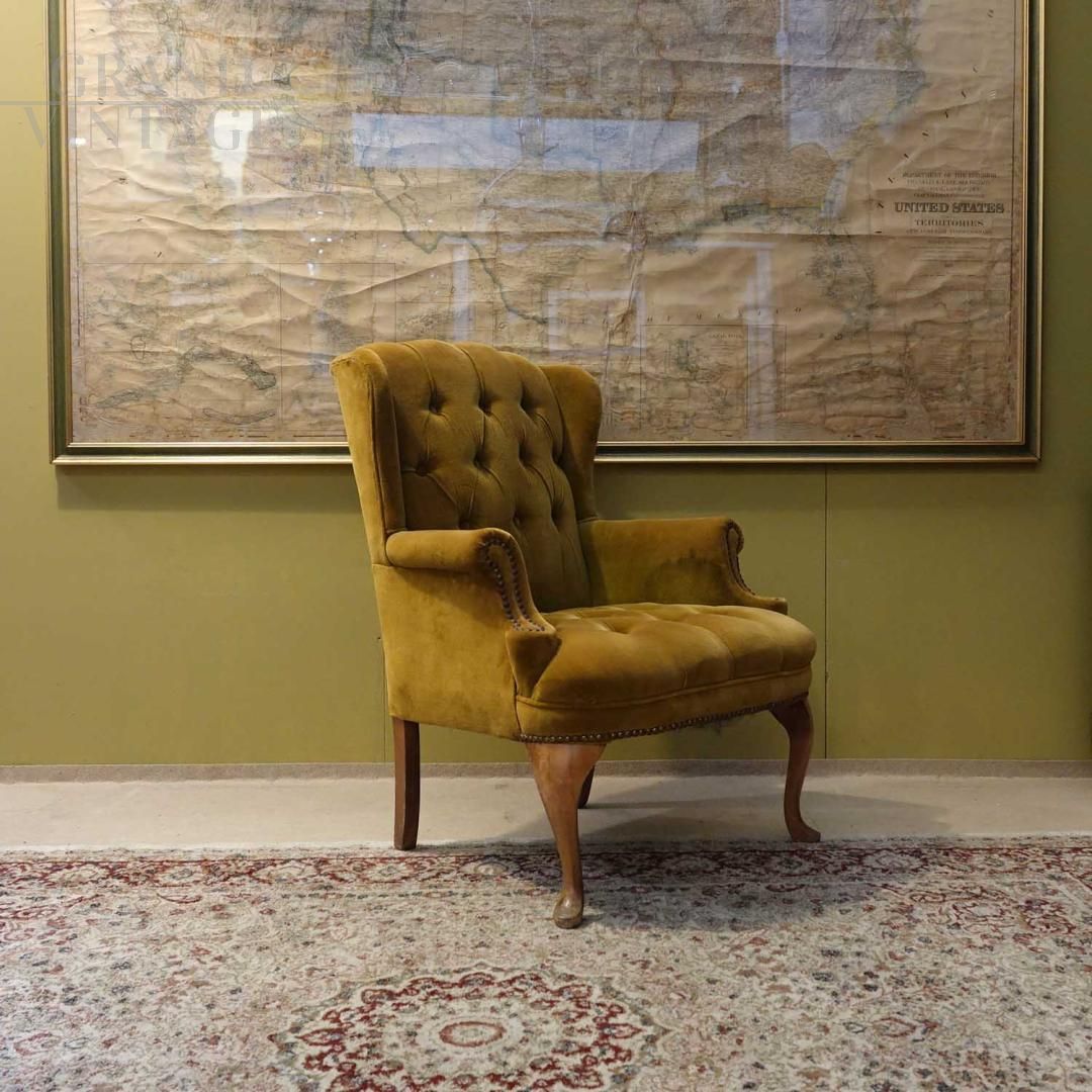 Vintage bergère armchair in yellow ochre velvet with a baroque look, a unique piece that combines elegance and memories of the past. Soft, enveloping and full of charm, it is perfect for enriching environments with a touch of discreet luxury and authentic personality. Ideal for spaces with a vintage, sophisticated or creative style.