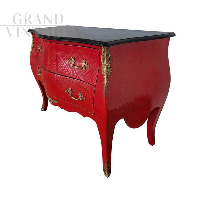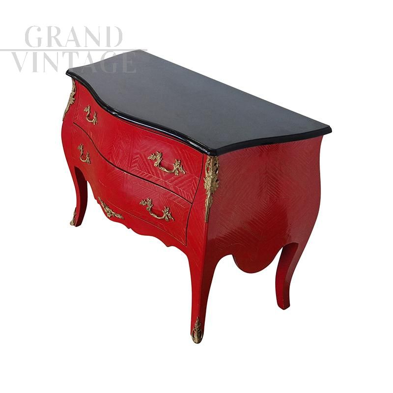 Antique baroque style chest of drawers with a splendid curved shape on the front and sides, equipped with 2 drawers, made of antique red lacquered wood with a shaped black top, enriched with gilded bronze decorations.