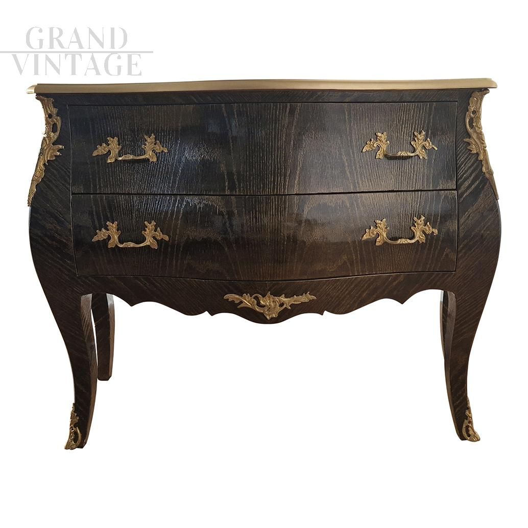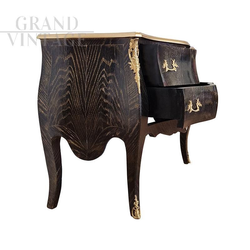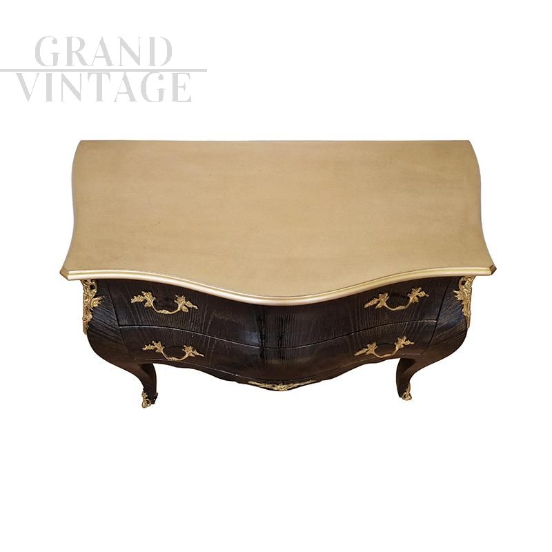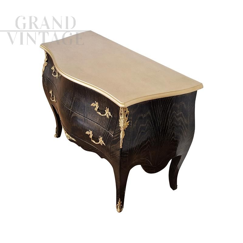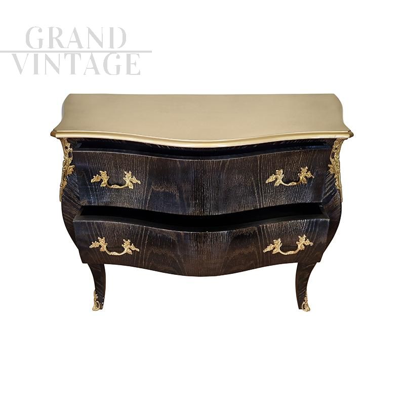 Antique baroque style chest of drawers with a splendid curved shape on the front and sides, equipped with 2 drawers, made of black lacquered wood decorated with floral designs and with a gold lacquered top, enriched with gilded bronze decorations and golden handles.