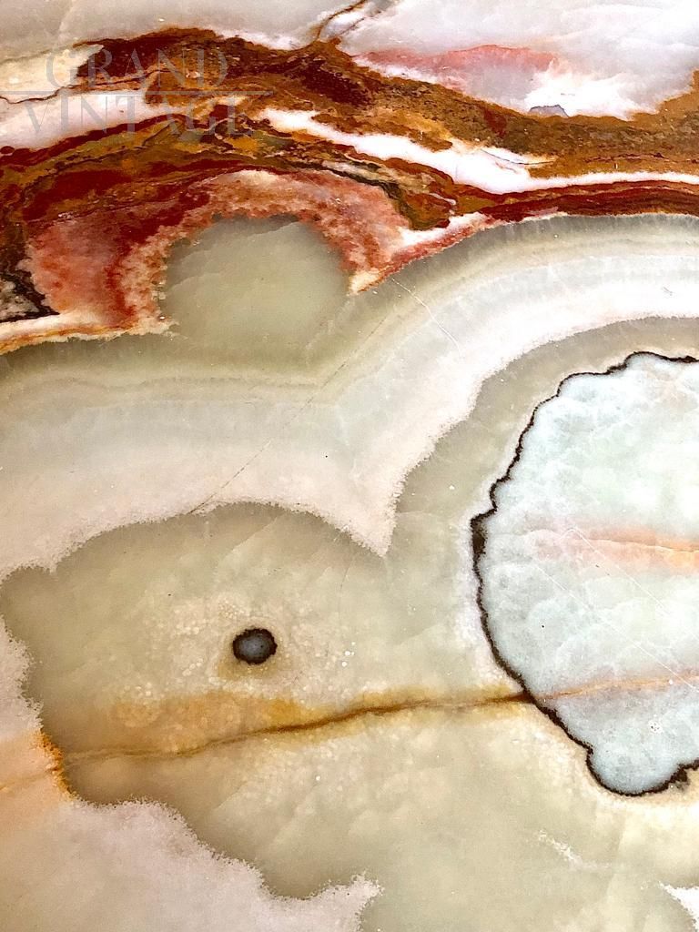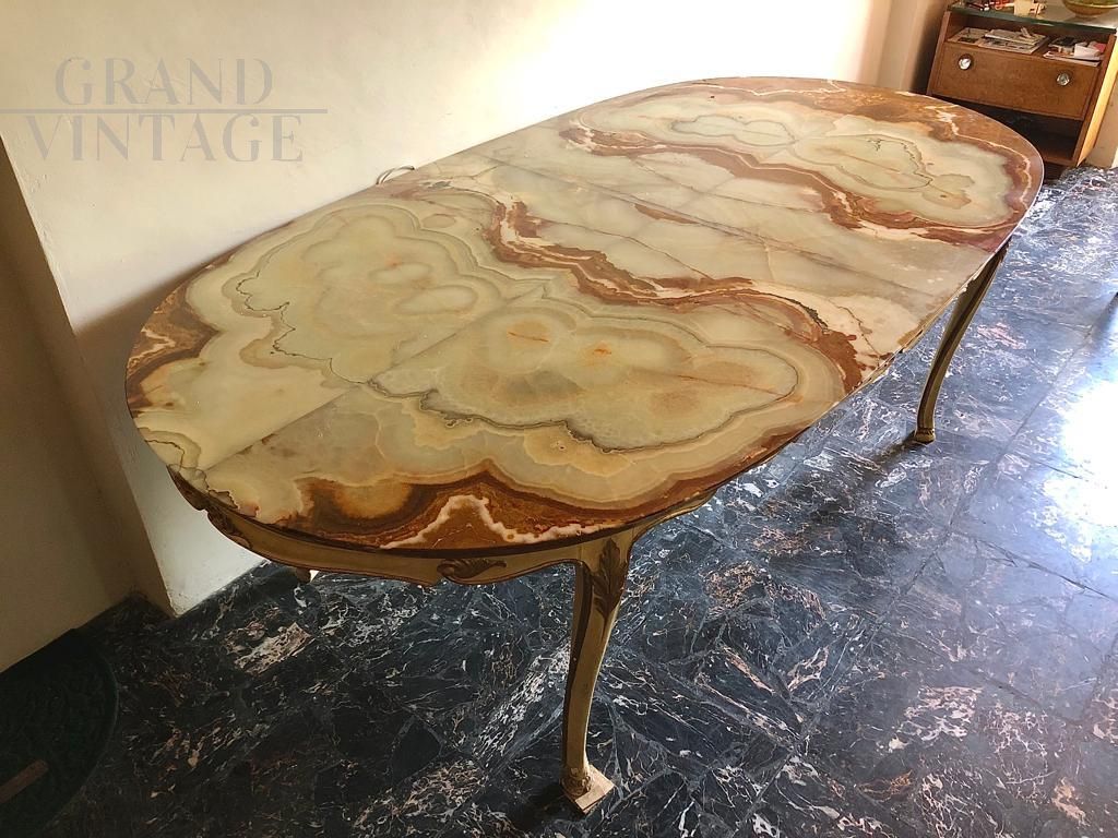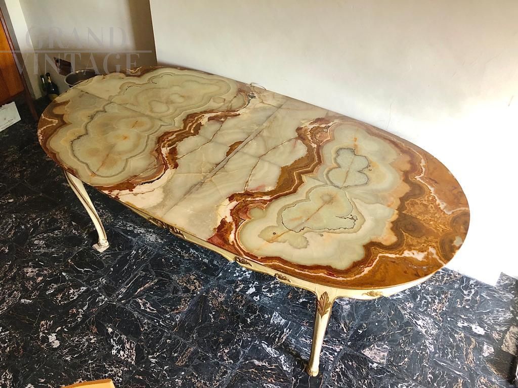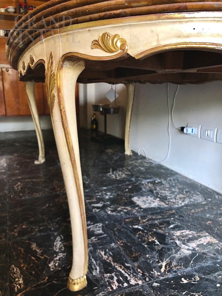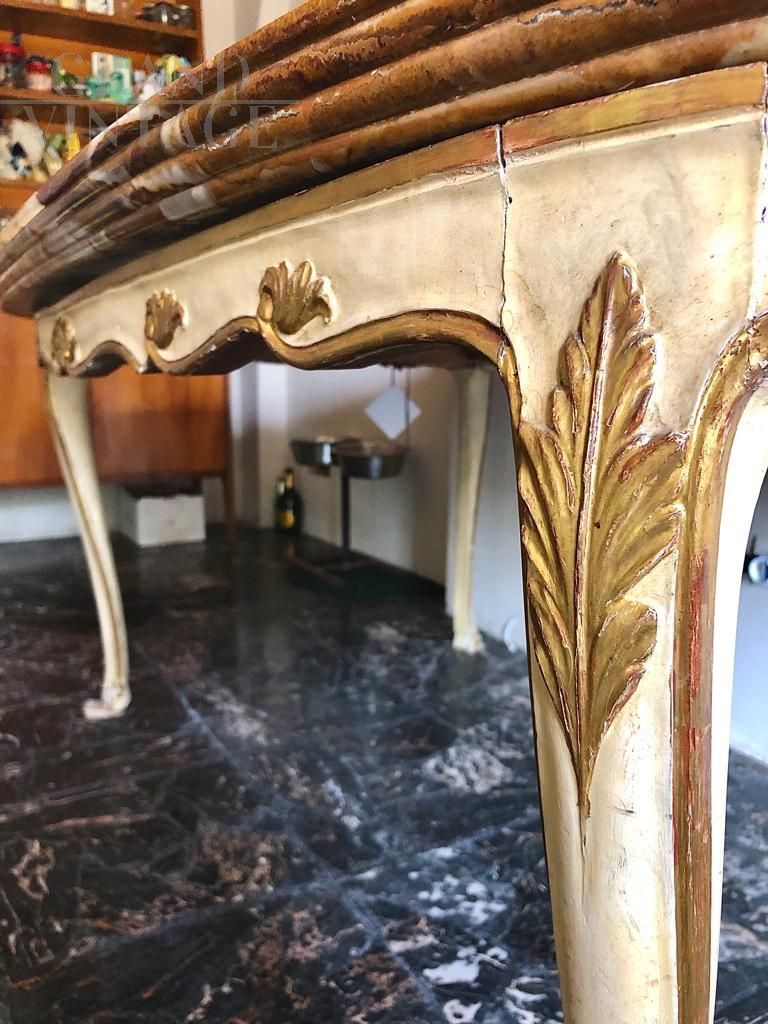 Large Baroque style table in white lacquered wood with gilded decorations and precious alabaster top with beautiful veins, Italy 1950s.