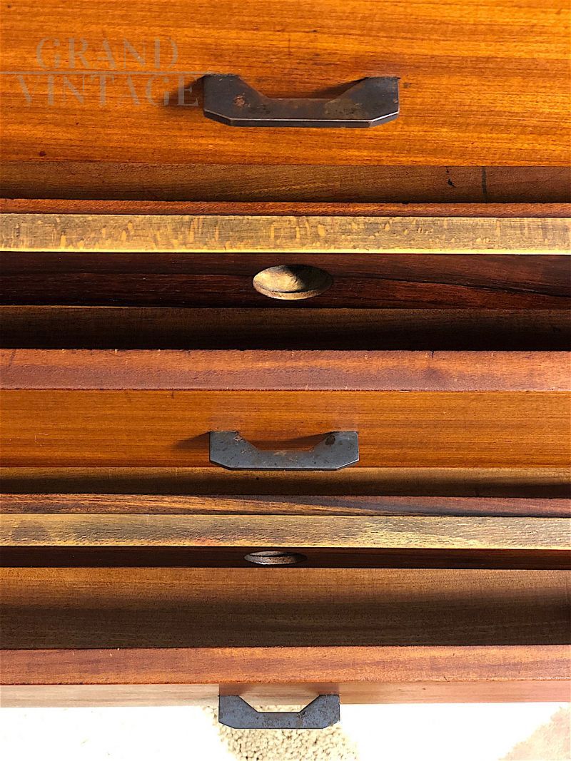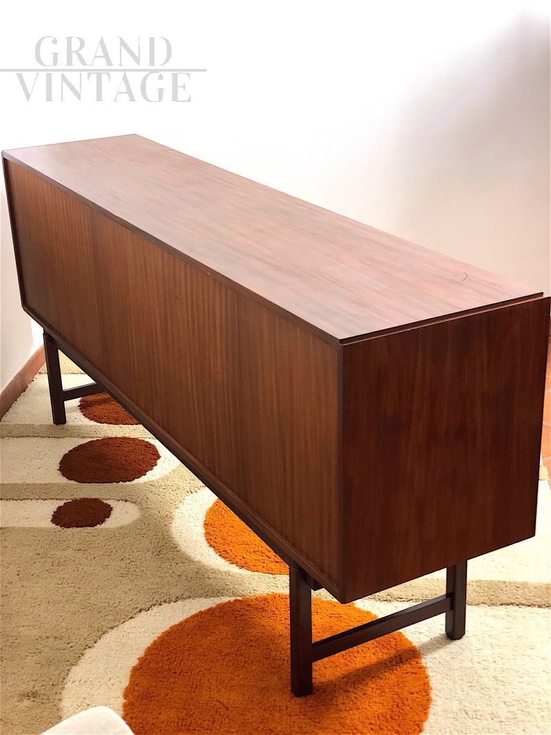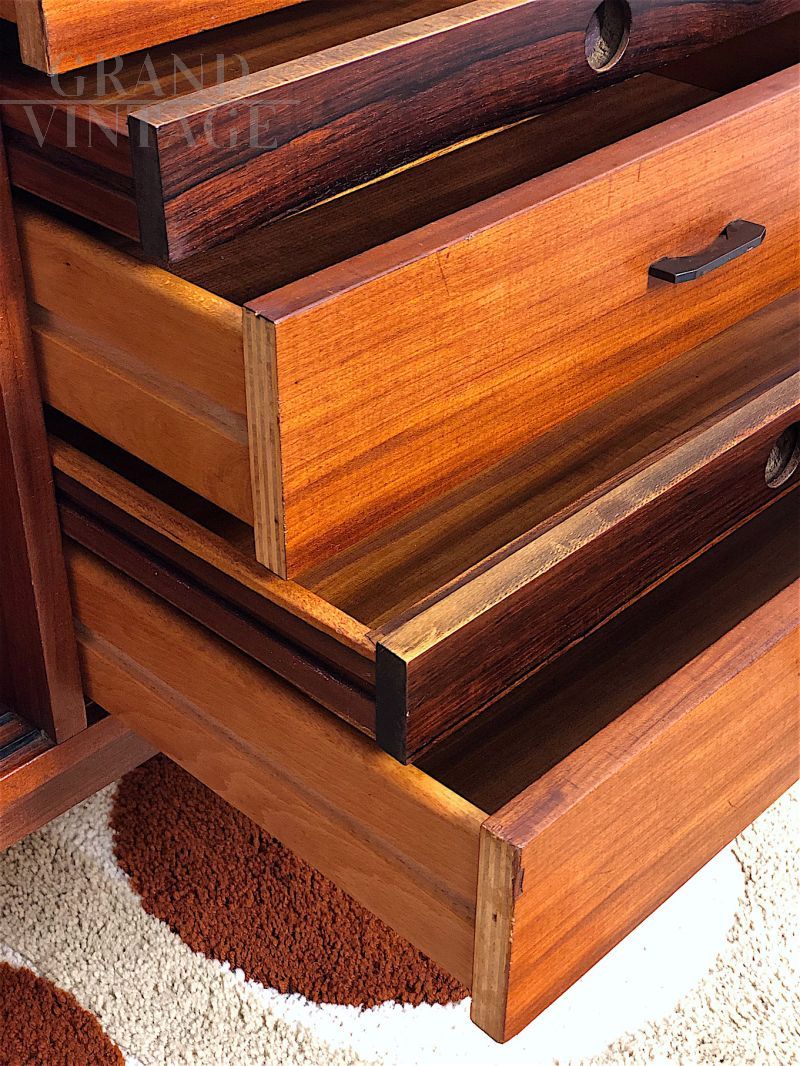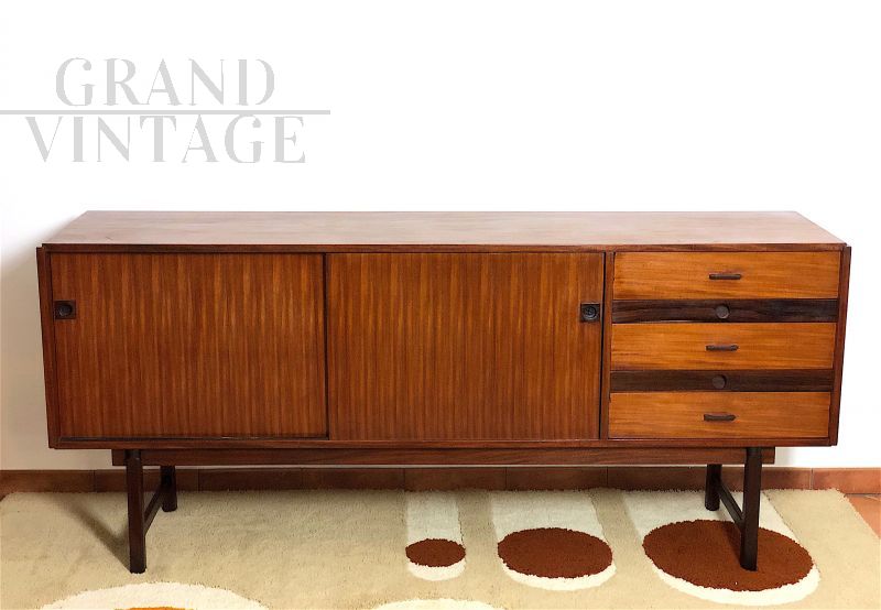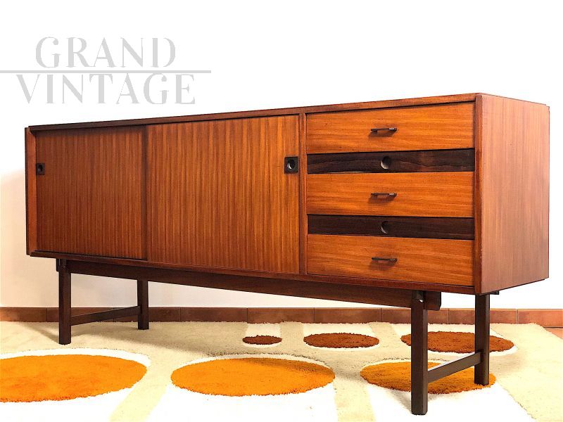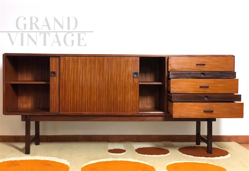 Sideboard Barovero by Selex, Italy 1960s. The Minimal and elegant design for this Sideboard made by the BAROVERO company of Turin for the Selex line. The piece of furniture is made with a very high quality and rich in details: asymmetrical edges, handles and accessories in bronzed brass, parts in lacquered wood. The piece of furniture is composed of a pair of sliding side doors and internal shelves, five drawers: three large drawers with metal handles and two small ones with a circular recess, wooden legs with metal details. Made of wood with Teak veneer. The Sideboard has been completely restored and is in perfect condition. Size: Width cm 195 - Height cm 85 - Depth cm 44.