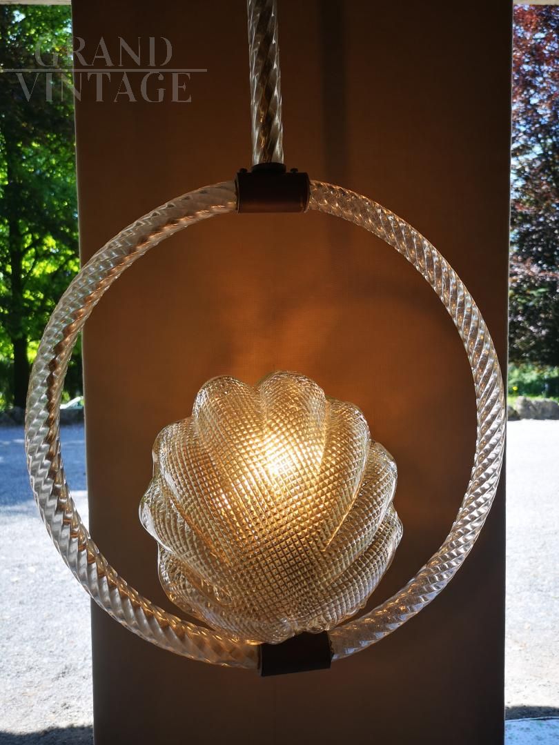 Barovier and Toso 20s / 30s chandelier in transparent Murano glass with brass details, perfectly preserved and functional. The chandelier is handmade by master craftsmen of Murano in the Art Deco period. The two central leaves have a particular relief process that allows the light to diffuse, creating chromatic games and at the same time hiding the bulb (E27).