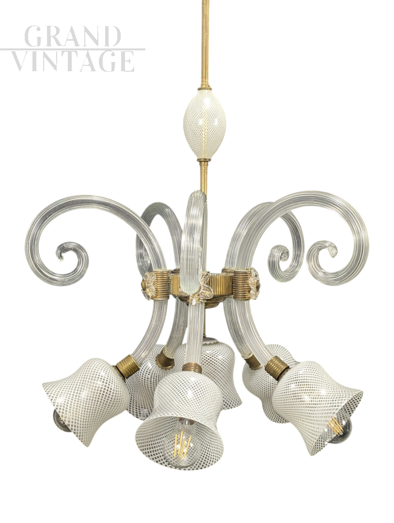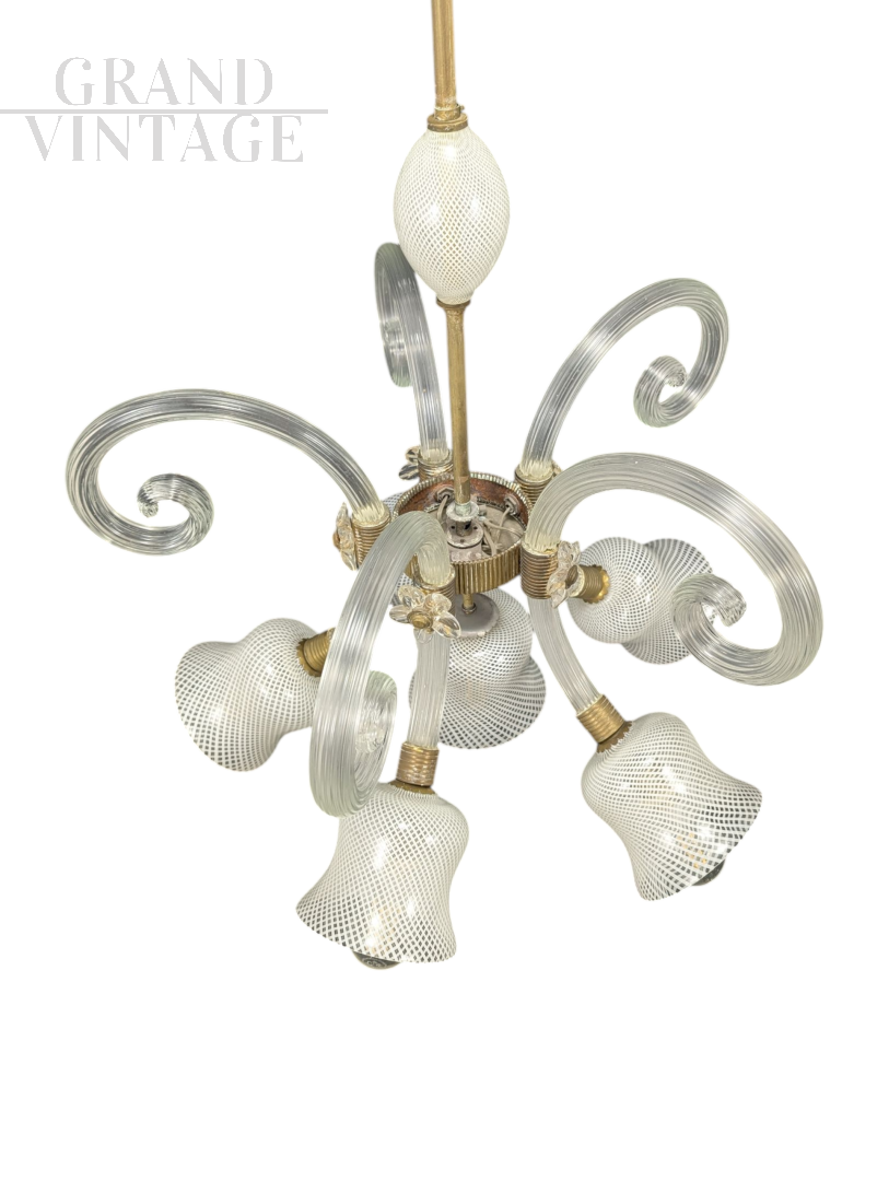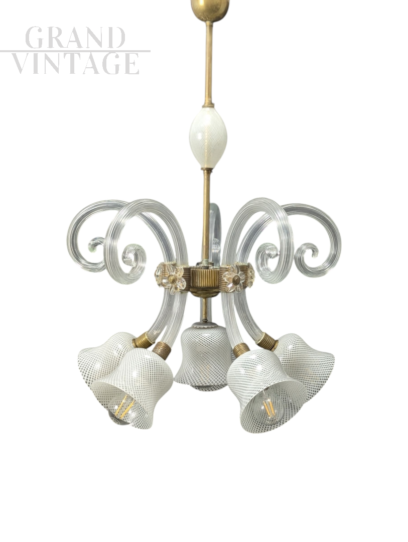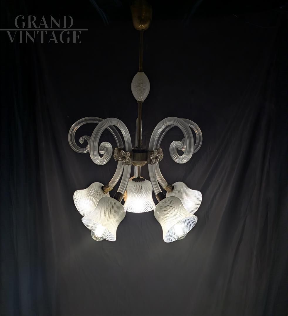5-light chandelier in Barovier and Toso style from the 1940s, in excellent condition, electrical system working and tested. Dimensions 95 x 60 cm (height, diameter)