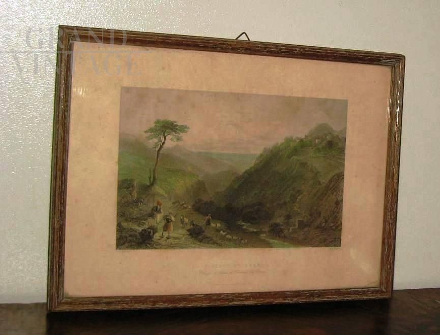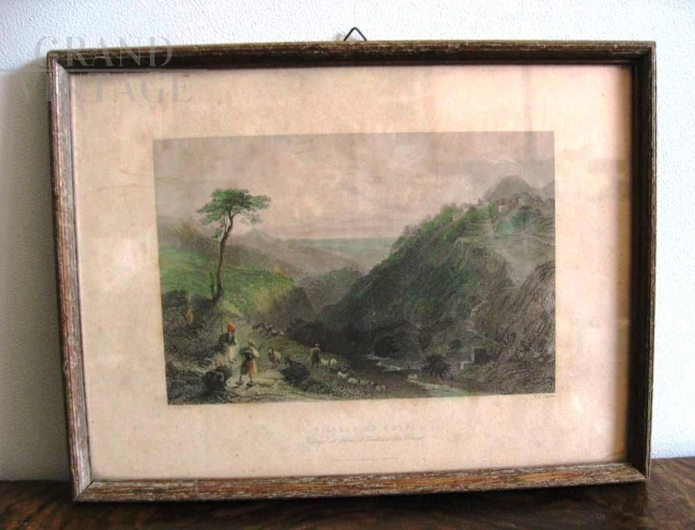 Antique colored print within a glass frame, entitled Village of Eden - Village d’Eden et Tombeau du Consul Fisher. Son. & cp. London & Paris 1842.