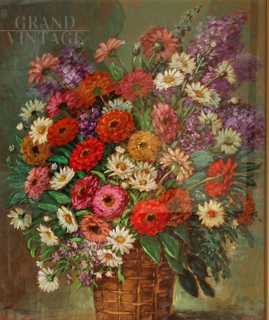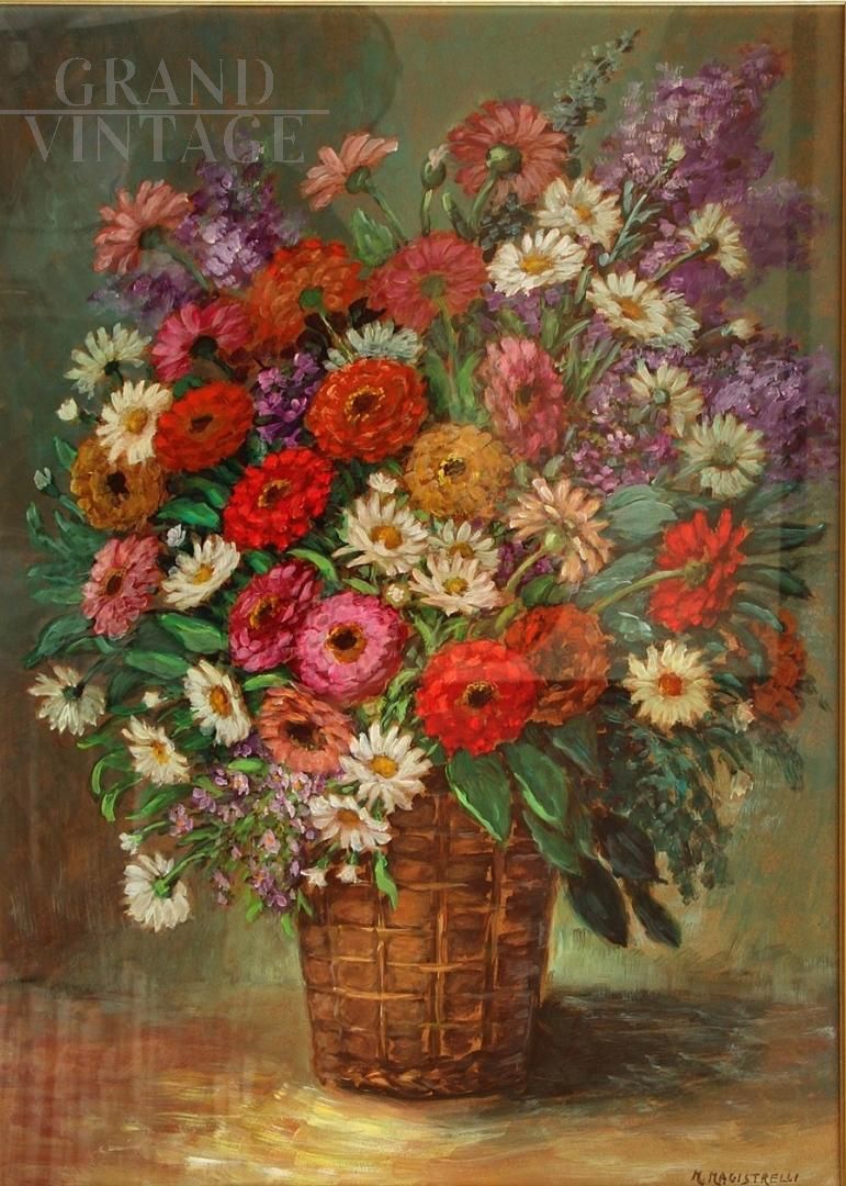 Painting with Basket of Wildflowers, an important artwork by the painter Miranda Magistrelli, born in Magenta (Milano, IT) in 1927 and died in Vercelli in 2007. Pupil of the painter Giuseppe Rinone, Miranda has participated in numerous personal and collective exhibitions.