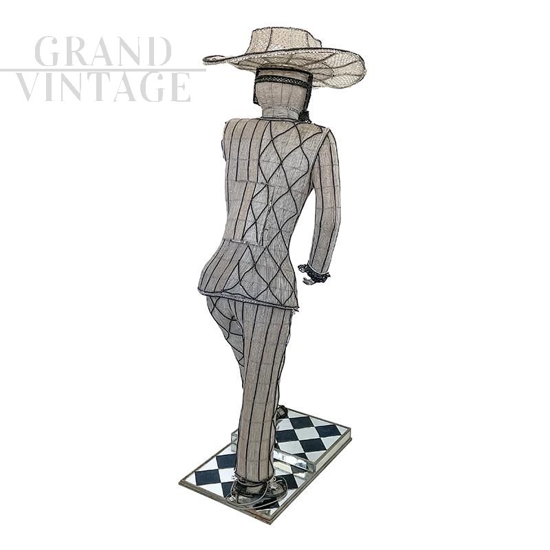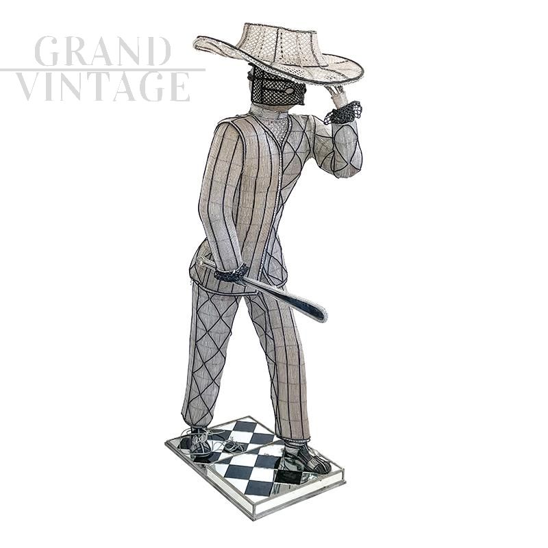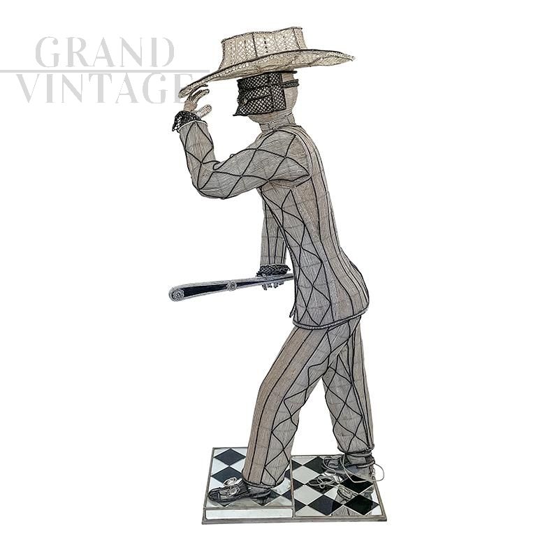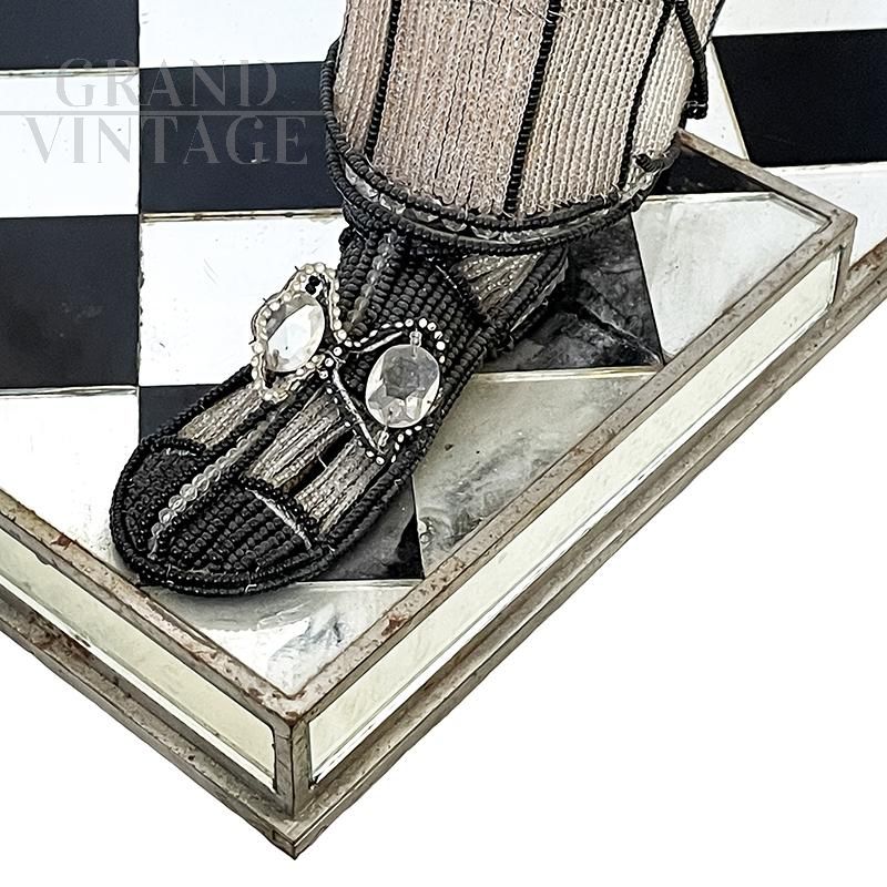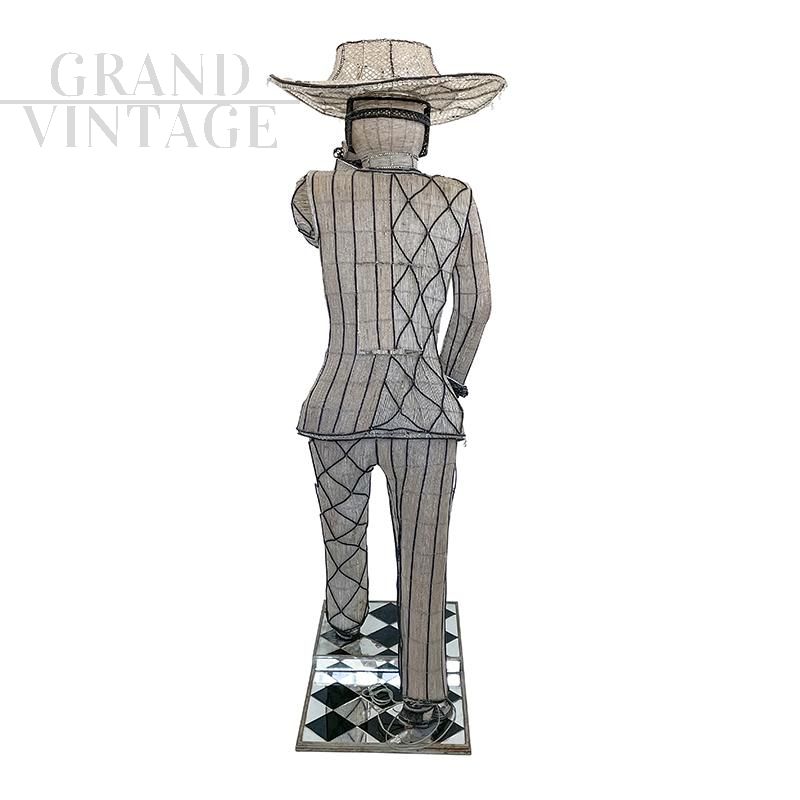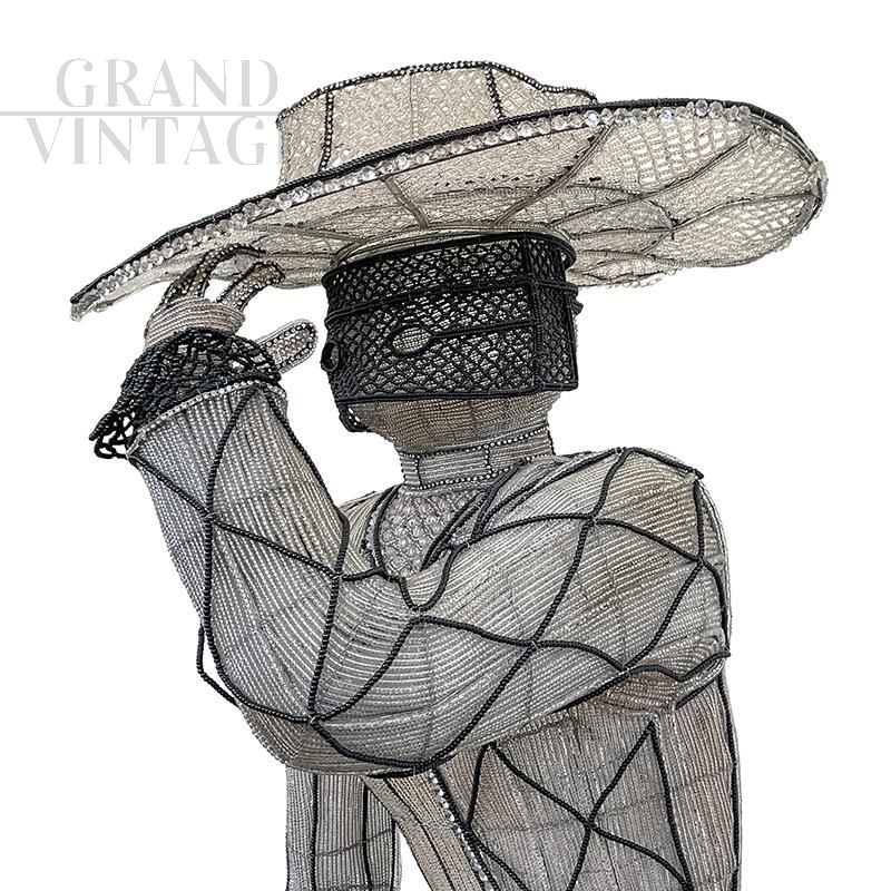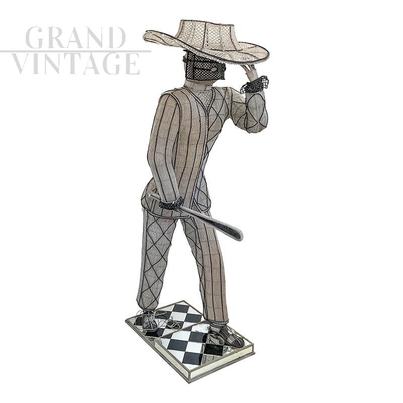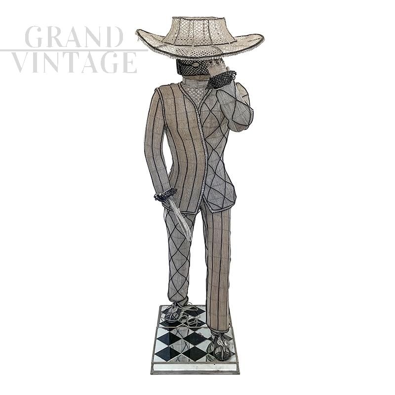 Floor lamp depicting a masked character with hat and sword, entirely handmade, with a metal structure completely covered with transparent and black Murano glass beads and decorative elements in cut glass; checkerboard base in black and mirrored glass. The floor lamp is equipped with seven sockets for E14 type bulbs.