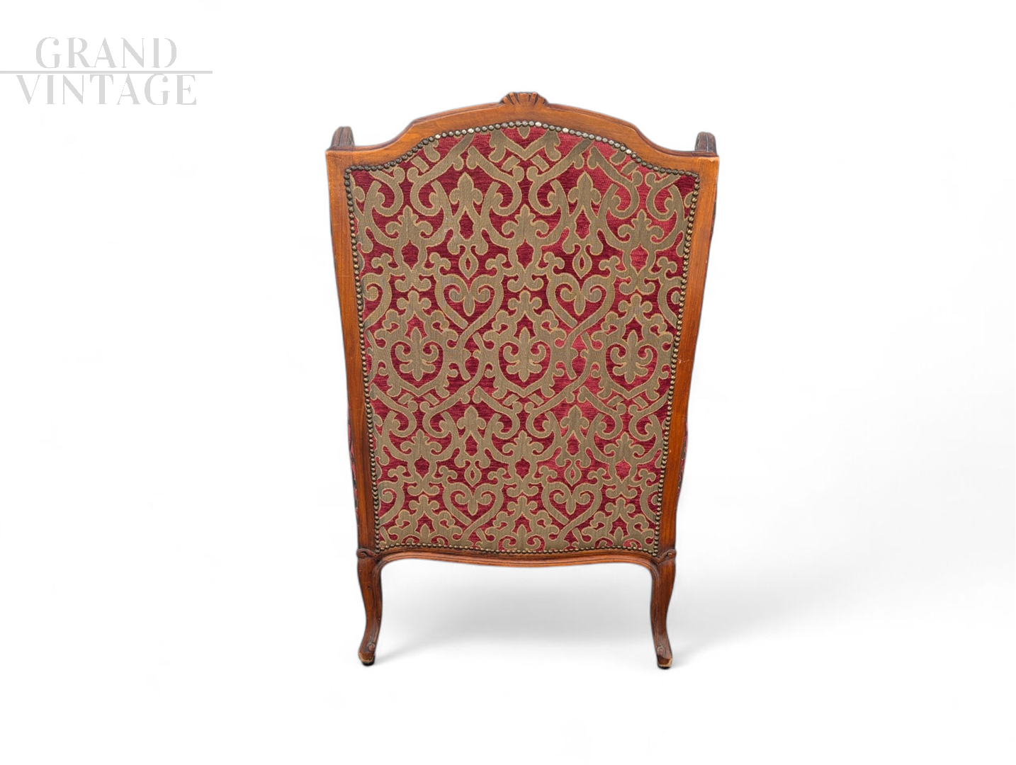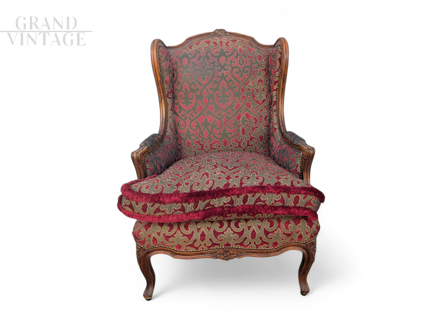 An elegant Louis XV-style Bergère armchair, featuring a refined hand-carved wooden frame, cabriole legs, and sculpted floral motifs. The upholstery is covered in a damask fabric with baroque motifs in shades of red and antique gold, secured with a row of decorative studs that enhance its profile. The enveloping shape of the high, rounded backrest, combined with the contoured armrests and wide seat, gives the chair a perfect balance of comfort and classic style. Ideal for period settings, elegant living rooms, or sophisticated reading nooks. Dimensions: Height: 105 cm Width: 71 cm Depth: 70 cm Seat height: 50 cm
