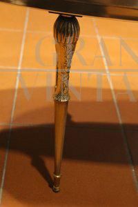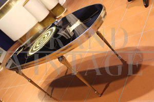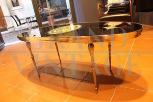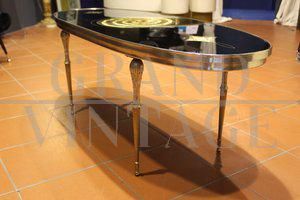Oval black and gold coffee table, Italian design from the 70s, with brass legs and black lacquered top with gold decorations. In excellent condition.
