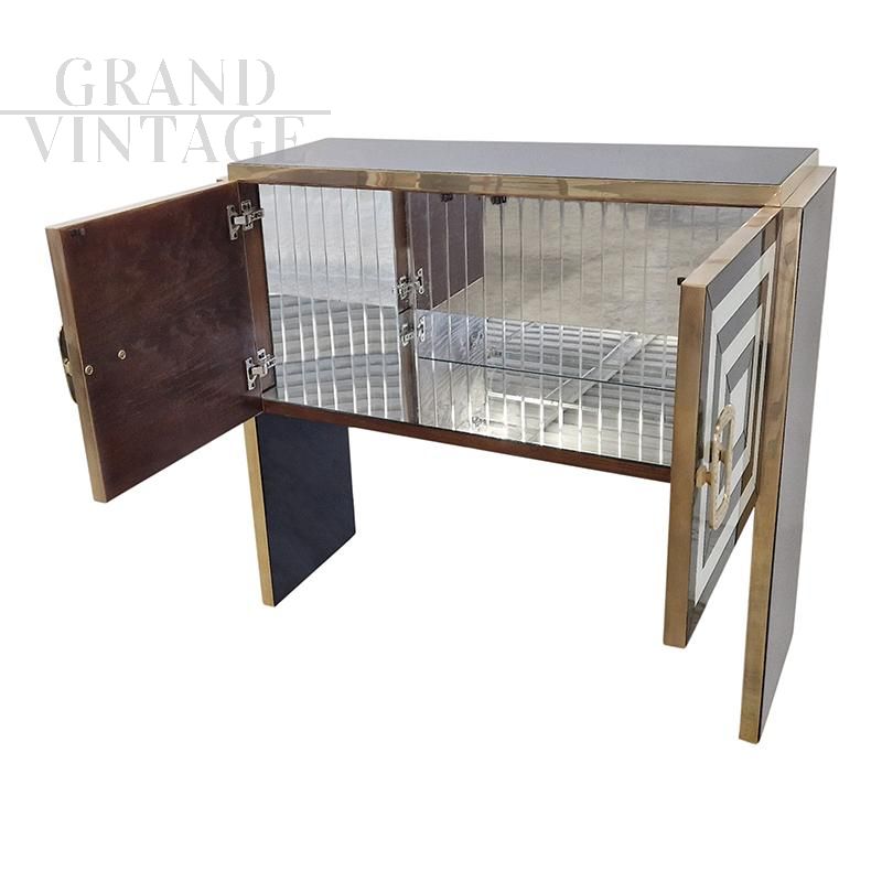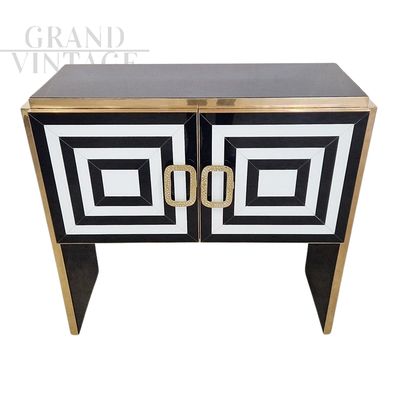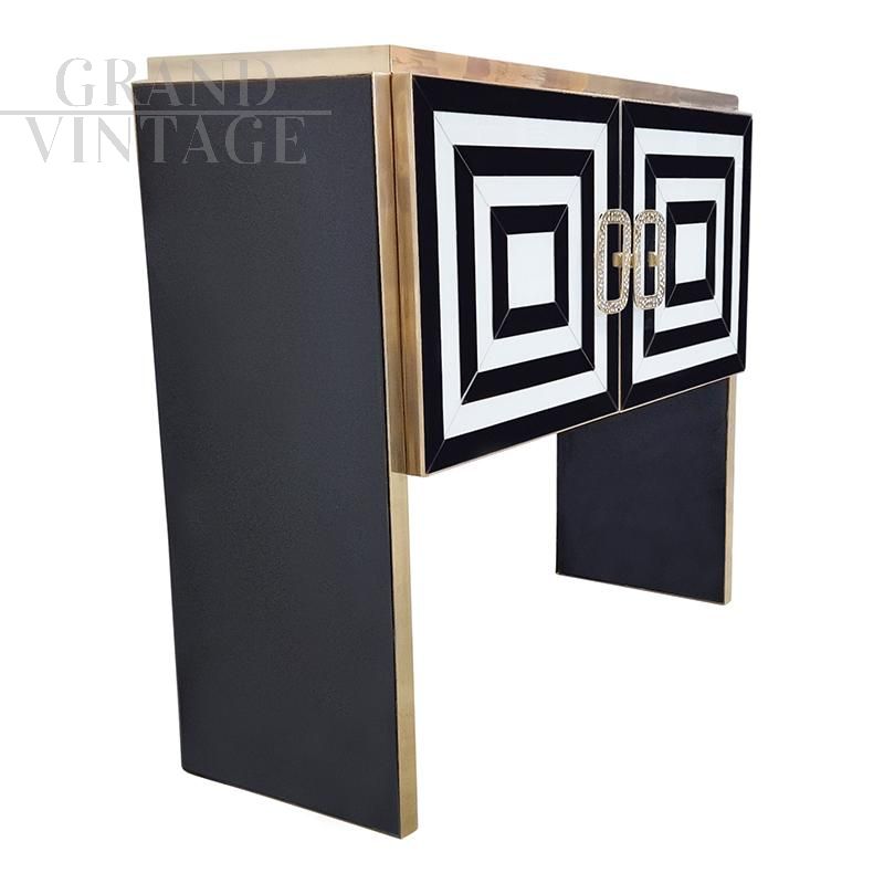 Small sideboard or bar cabinet entirely made by hand, with two doors and an internal compartment covered in mirror, wooden structure covered in black glass with geometric inserts in black and white glass on the two doors; profiles and handles in golden brass.