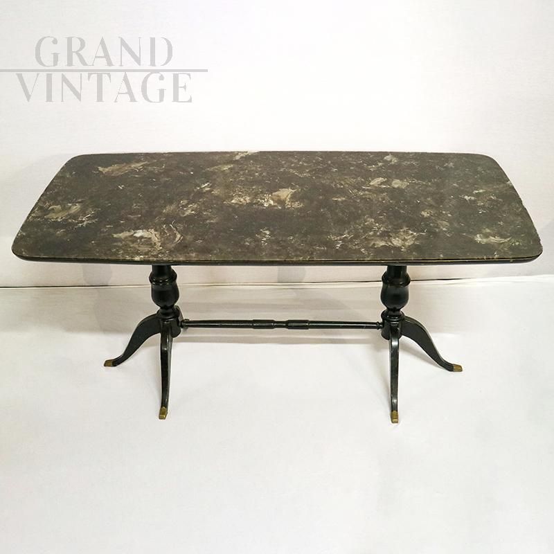 Elegant Italian Art Deco table from the first half of the 20th century with turned and black lacquered wood structure and back-treated glass top with black marble effect and veins; the leg ends are in golden brass. The table is in good general condition, with some small natural signs of wear.