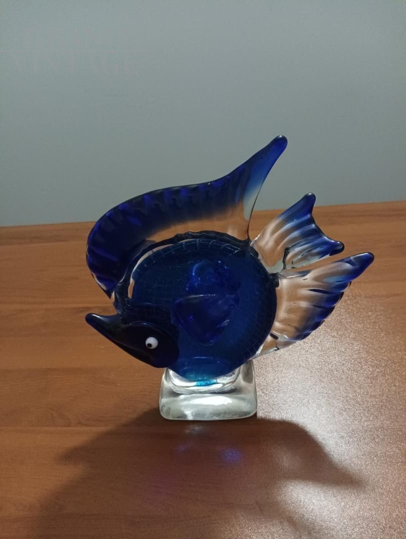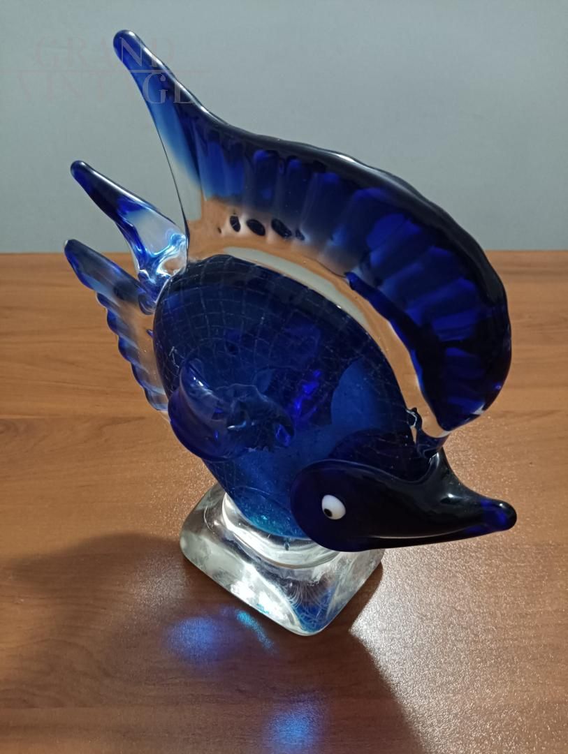 Stunning vintage glass sculpture attributable to Cenedese depicting a fish in blue and white, dark blue and gold reflections.