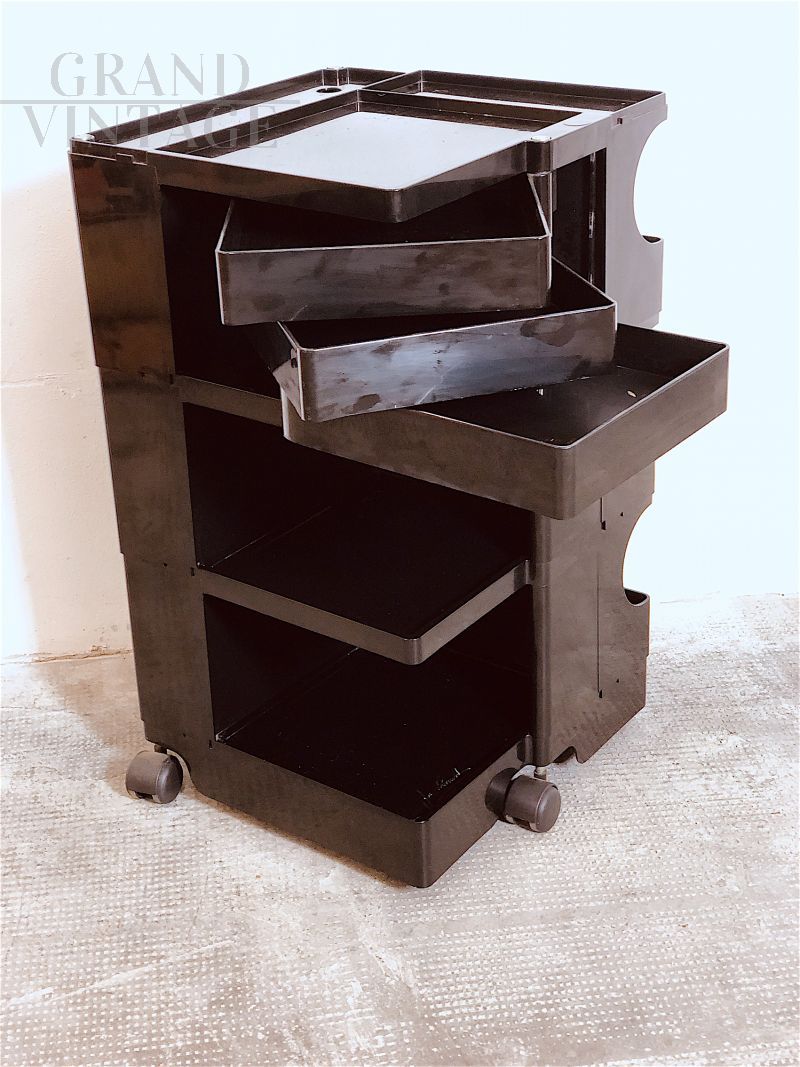 Boby architect's trolley designed by Joe Colombo for Bieffeplast in black plastic, first production, Italian design from the 1970s. The trolley represents the revolutionary originality of Joe Colombo's thought, and is associated with his ability to transform ideas into functional products. Over time, many of these have become true icons of Italian design, such as the Boby nomadic trolley, a container on wheels to be used both at home and in the office. Boby is a real sorting machine, thanks also to the trays of different heights and rotating on an axis placed on a corner. Drawers and compartments are made of injection-molded ABS, while the polypropylene wheels guarantee its characteristic mobility. In perfect condition.