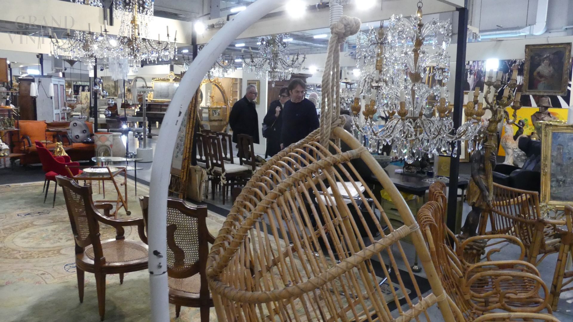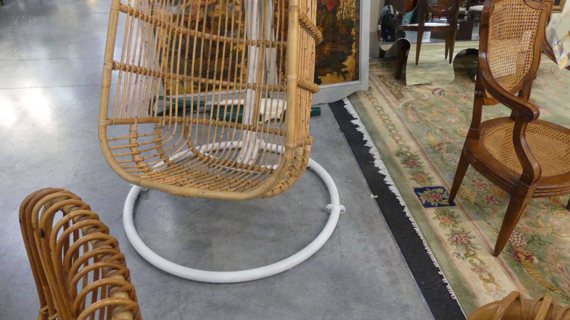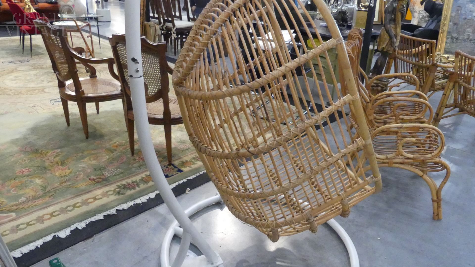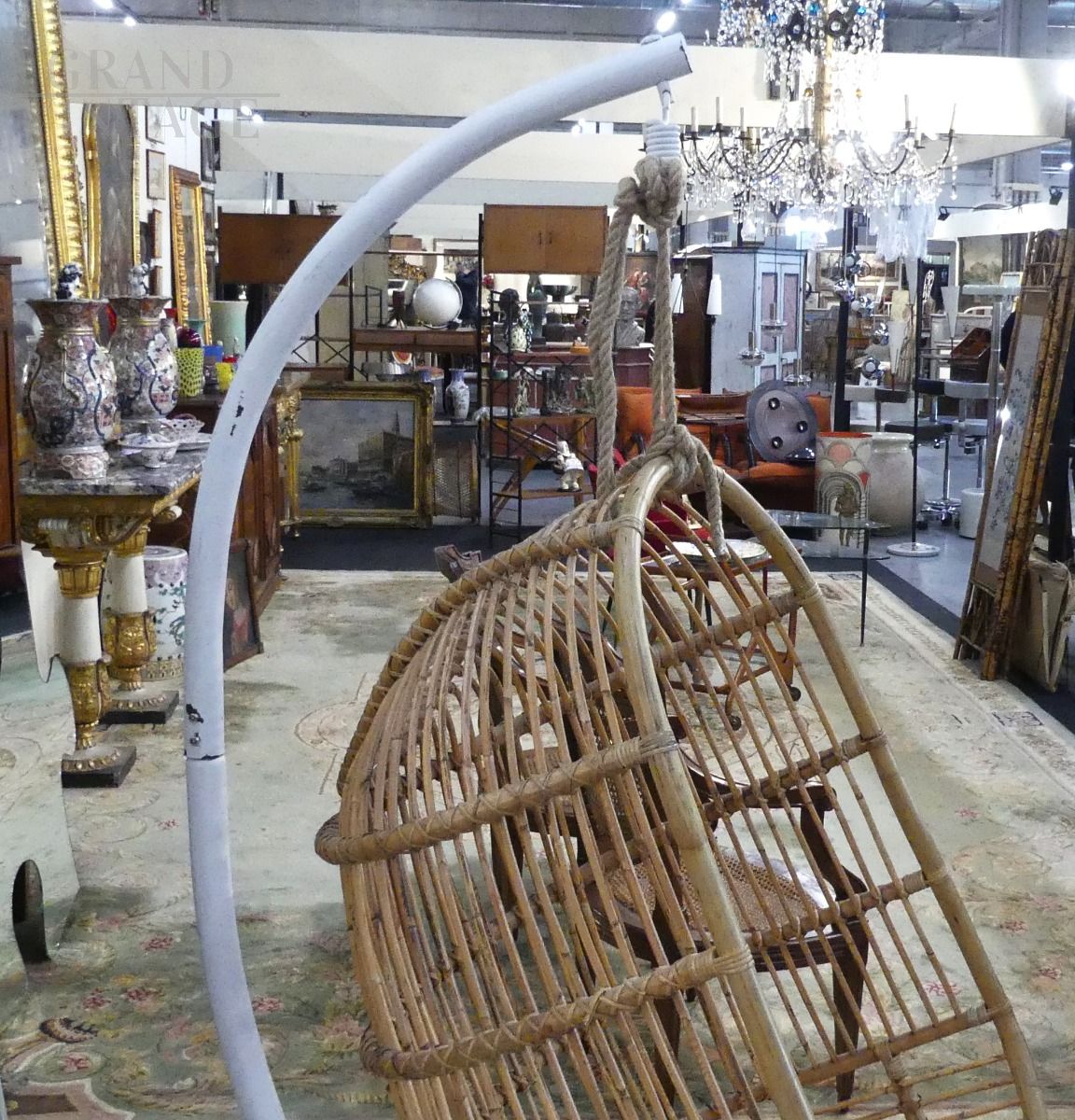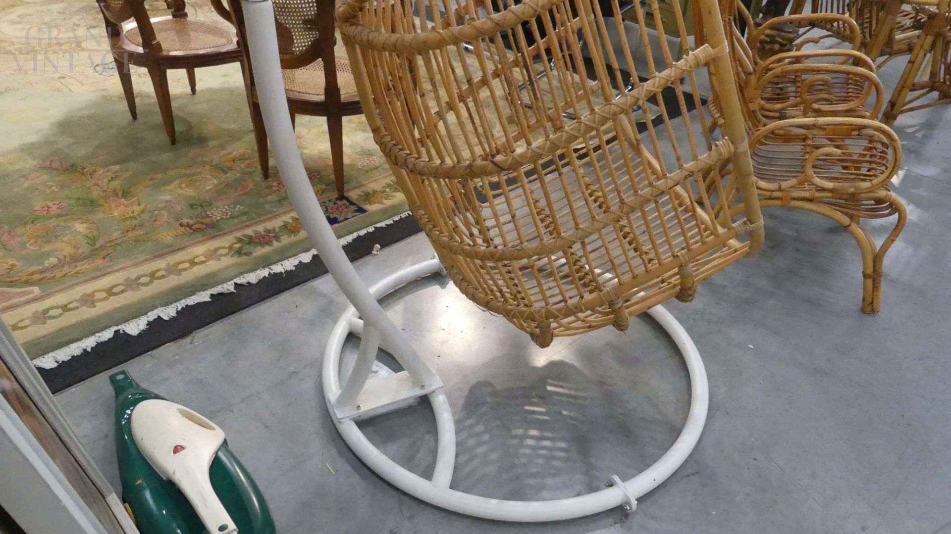 Original vintage bamboo hanging armchair in Bonacina style, in wicker with white lacquered metal frame, sturdy and in good condition.