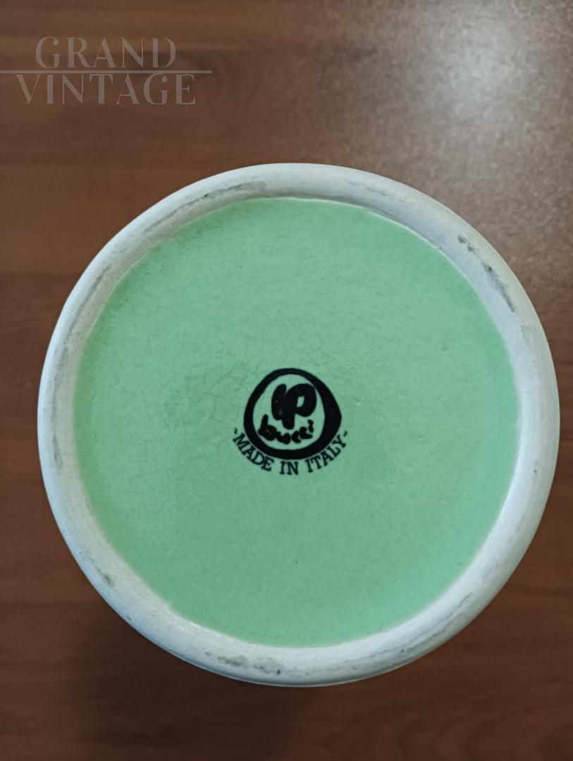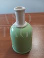 Vintage bottle vase design by Franco Bucci in light green and white ceramic, Italy, 1970s. At the base of the bottle is the brand. This vintage bottle-shaped vase has a sculptural and interesting appearance. The simple design and the delicate, almost engraved upper line represent a modern detail that enriches the simple shape of the vase. A decorative object that fits with style into a classic environment and an ideal furnishing element for those who appreciate essential and elegant design.