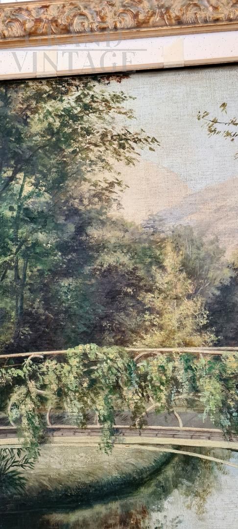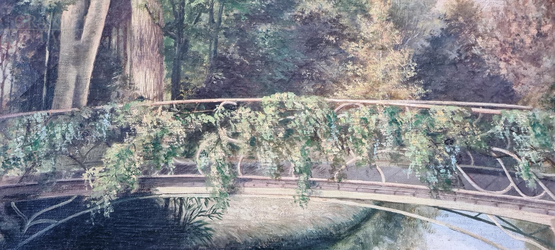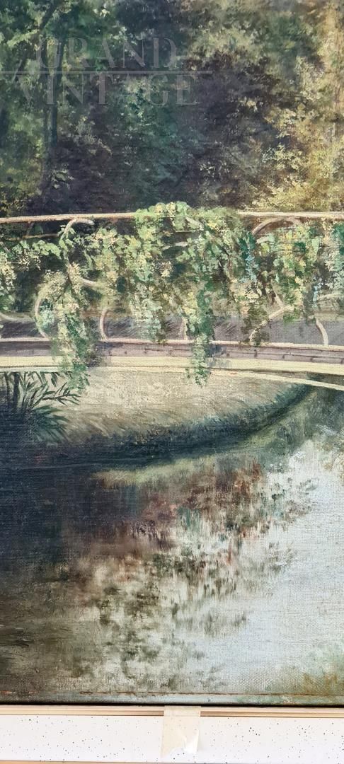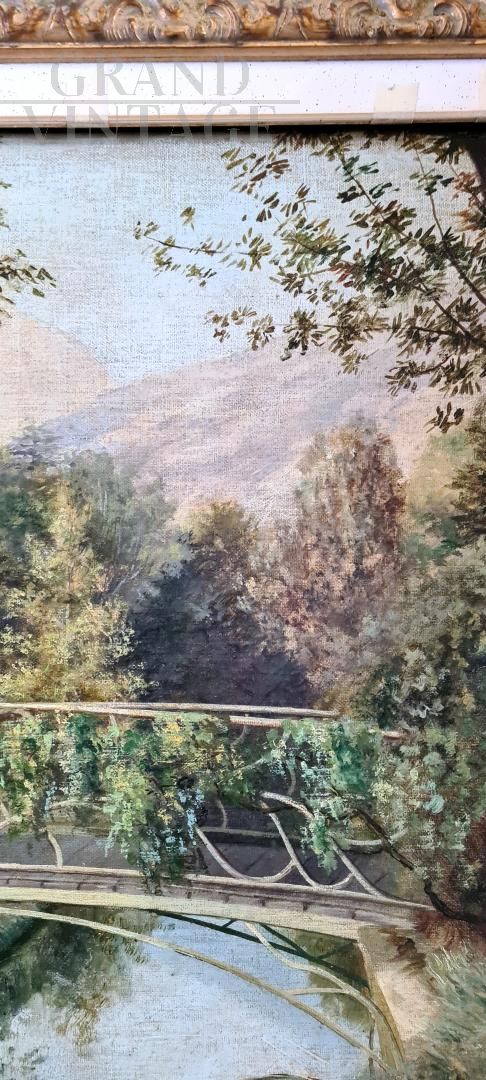 Painting with a French landscape from the twentieth century with a coeval frame, depicting a bridge over the river, of excellent pictorial quality.