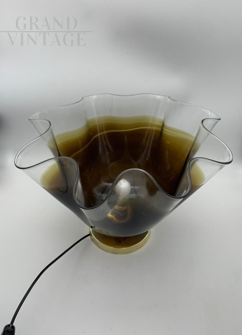 Brown Murano glass table lamp attributed to the Vistosi company, 1960s. The lamp has a handkerchief shape in blown glass with shades of brown and ocher, and rests on a brass base. The lamp is in good condition, functional and ready to use with a compliant electrical system that supports E27 bulbs, and is also suitable for LED bulbs. The object is ideal to be placed in elegant and refined environments, or even in rustic environments or modern furnishings.