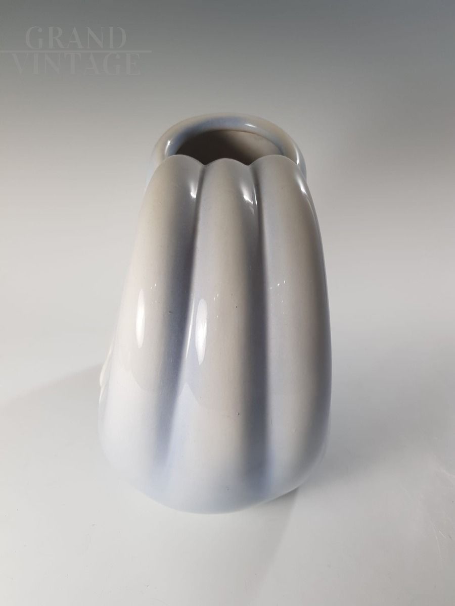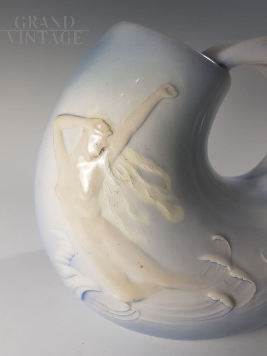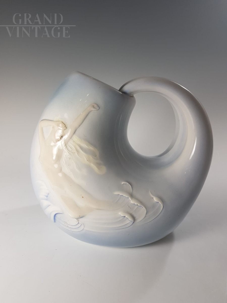 Brunetti ceramic vase from the 1930s, signed on the base, with a beautiful wave shape and with a mermaid depicted in relief. The vase is in pastel light blue, while the mermaid stands out from the background in creamy white.