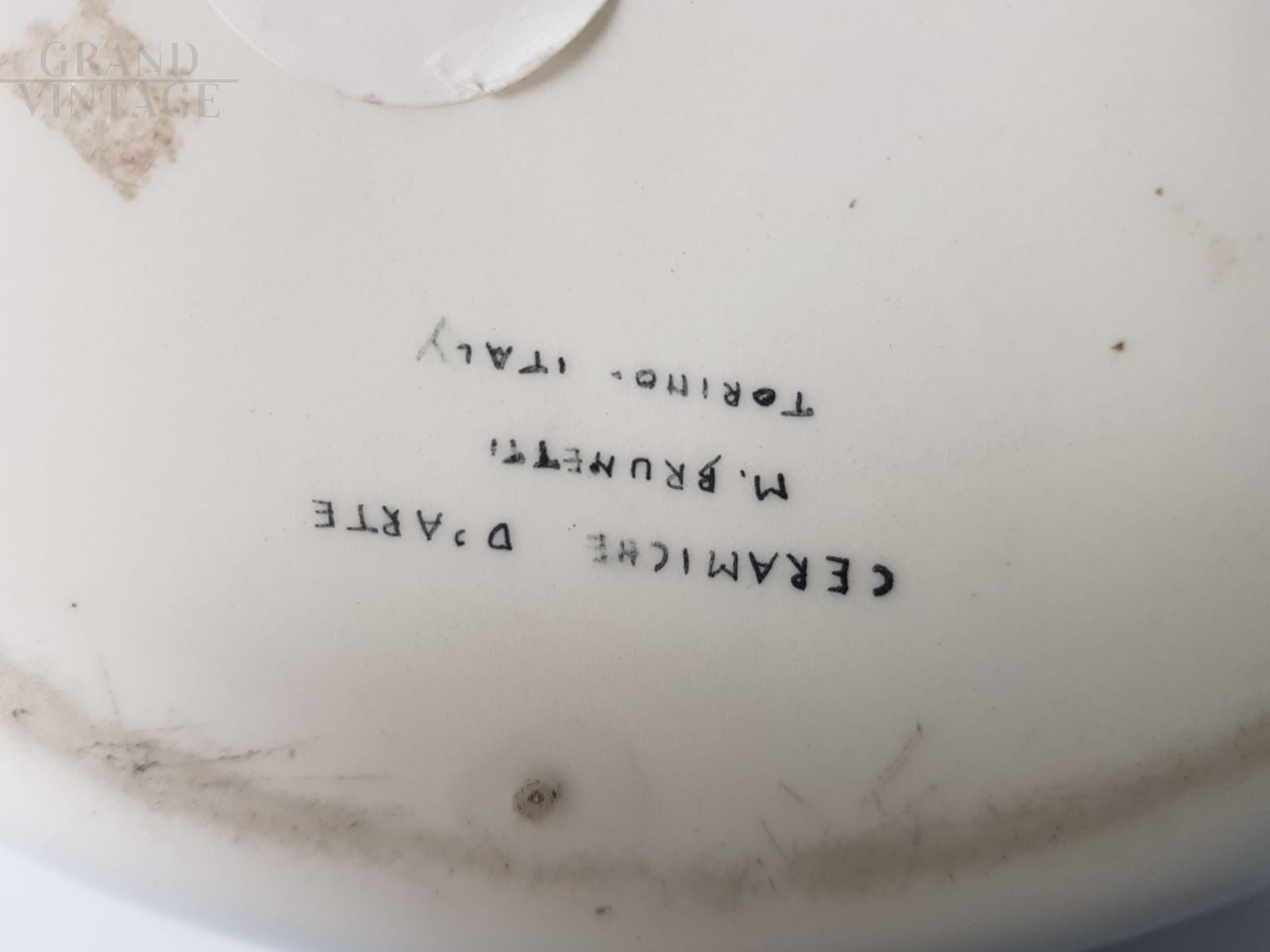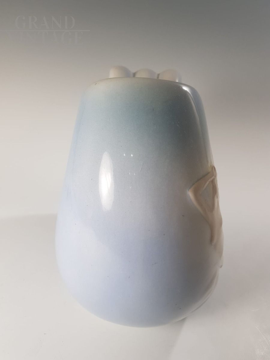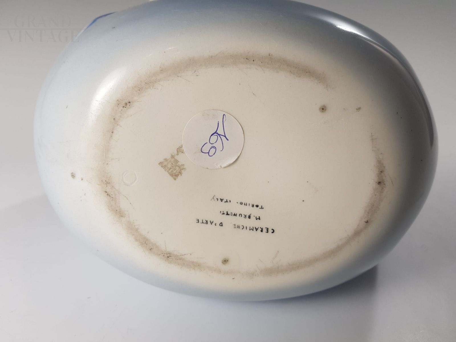 Brunetti ceramic vase from the 1930s, signed on the base, with a beautiful wave shape and with a mermaid depicted in relief. The vase is in pastel light blue, while the mermaid stands out from the background in creamy white.