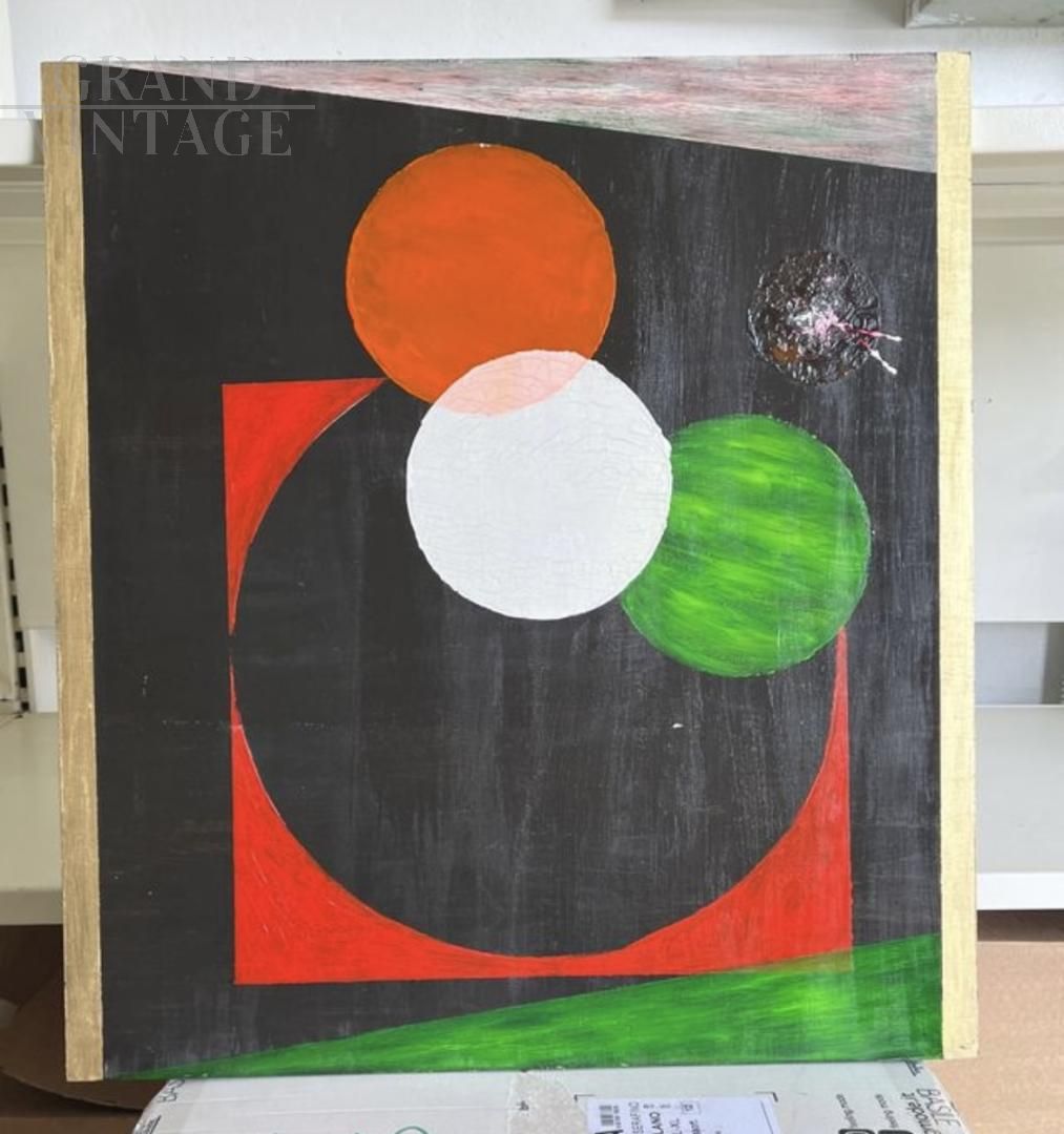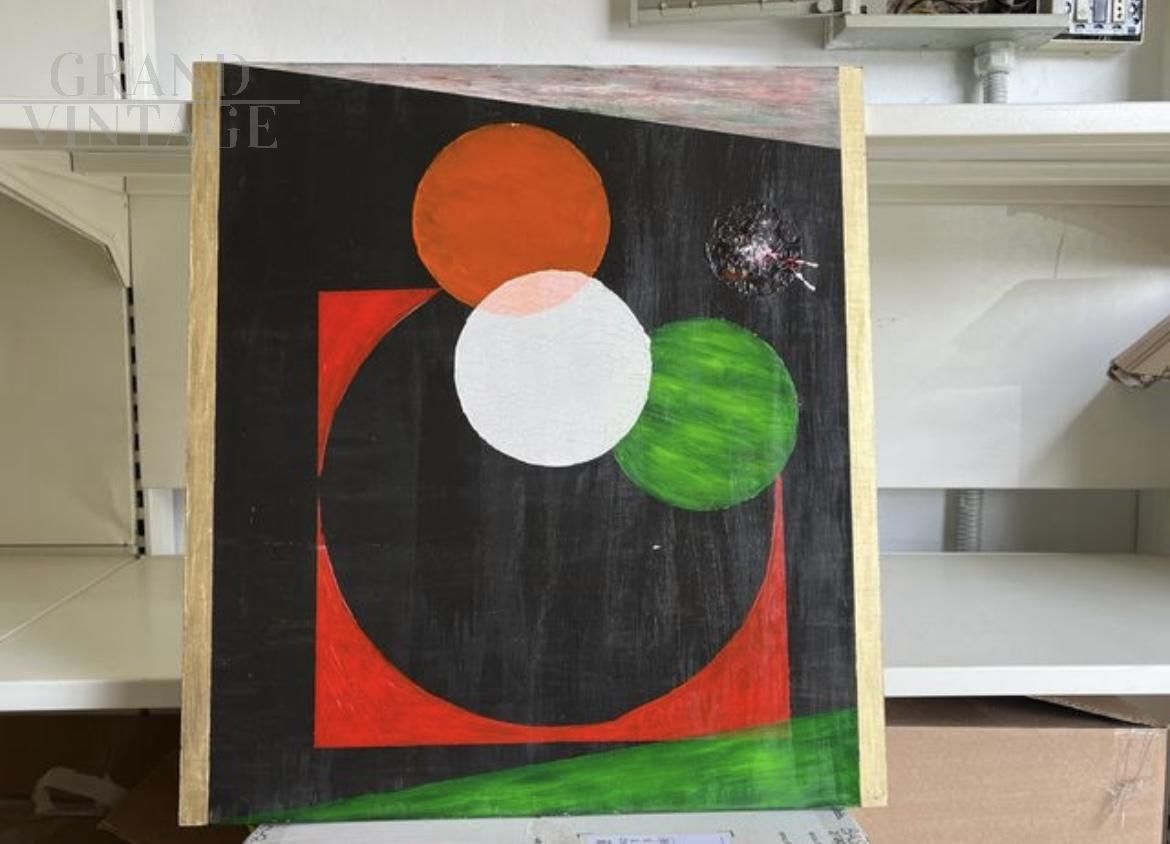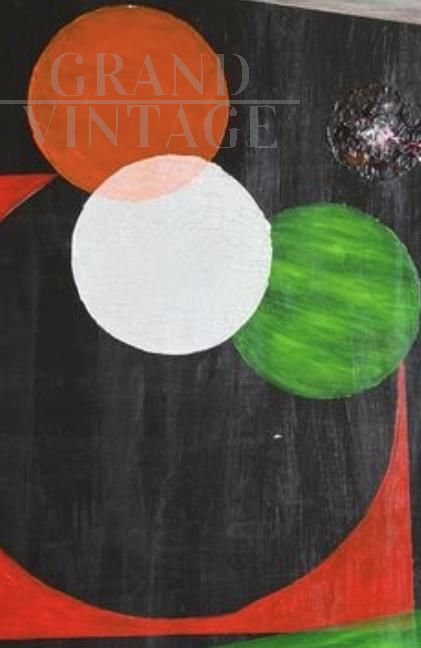 Abstract painting from 2023 created by the Sicilian artist Bruno Carlino (1952) on wood with tempera and enamel, entitled Spheres. An almost three-dimensional artwork where the main protagonists are the spheres, planets of various colors and sizes that intersect with each other. Ideal painting for modern environments, with certificate of originality.