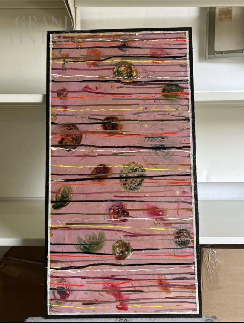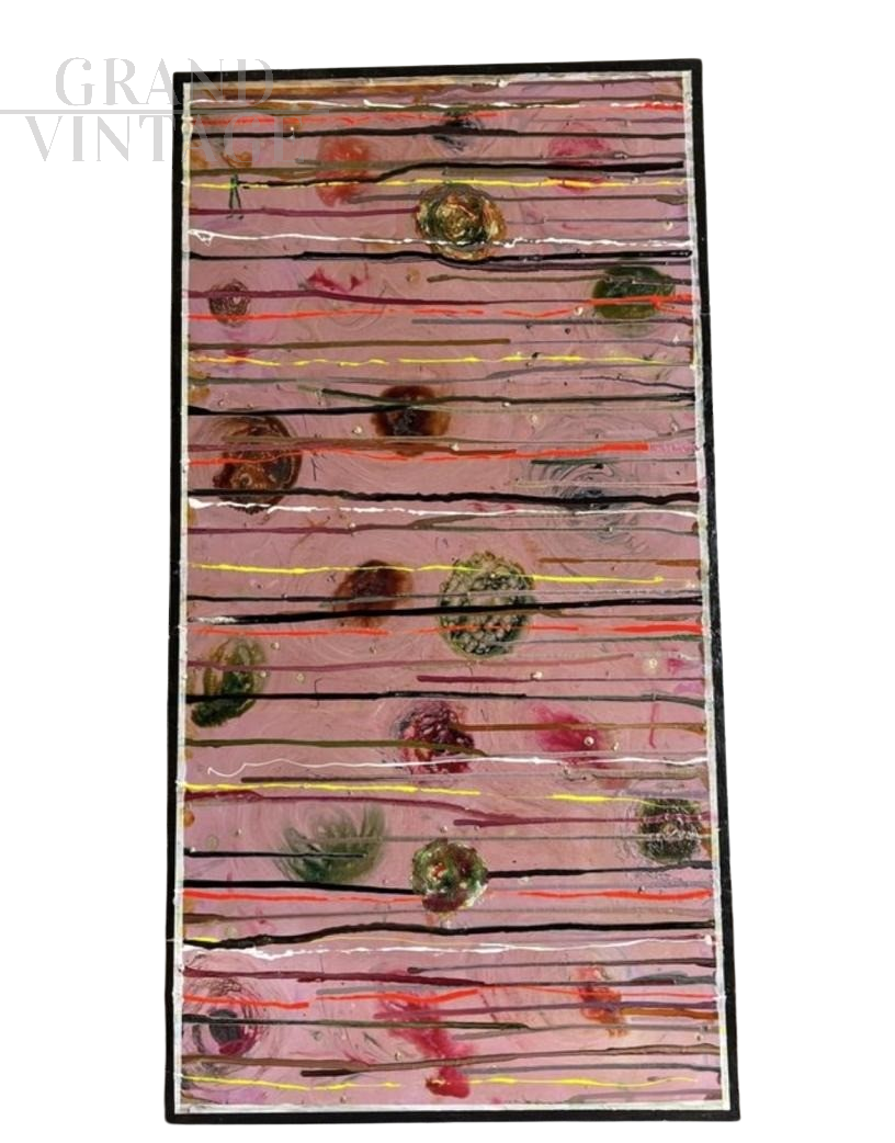 Abstract painting from 2023 created by the Sicilian artist Bruno Carlino (1952) on wood with tempera and enamel, inspired by the artworks of Vittoria Palazzolo. An original artwork in which the artist gives vent to his creativity and skills as a copyist, managing to equal the famous works of the Turin artist. Work with certificate of originality.