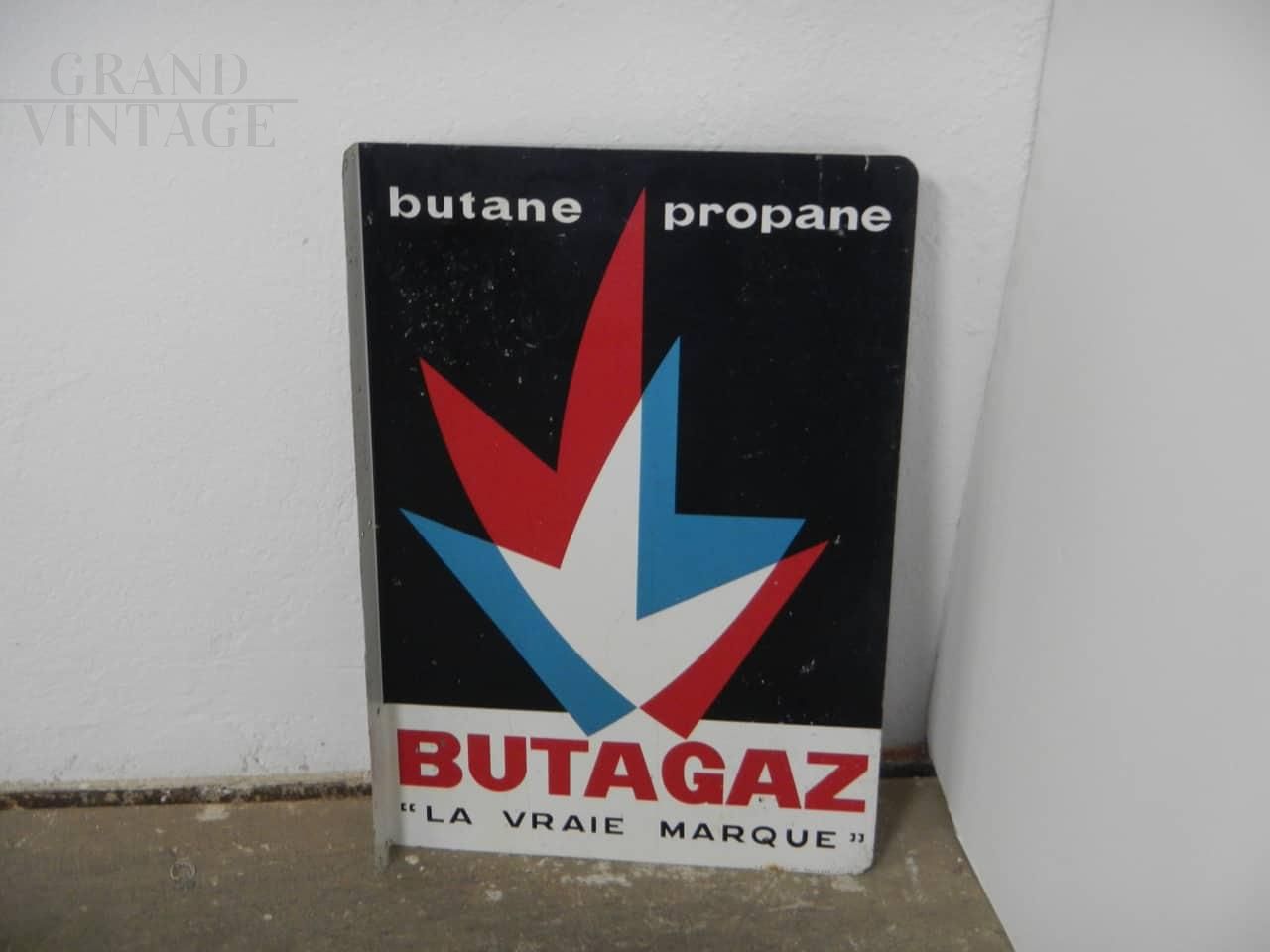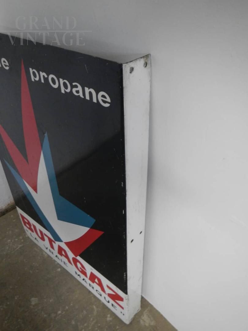 French double-sided metal advertising sign from the Butagaz company, with lateral support for hanging, completely original.