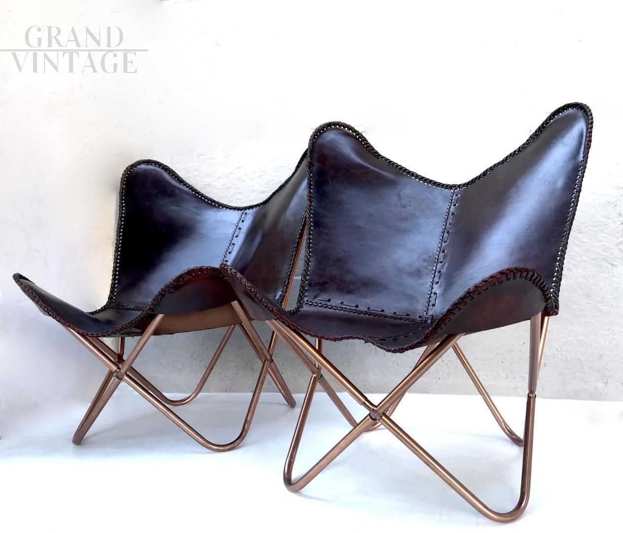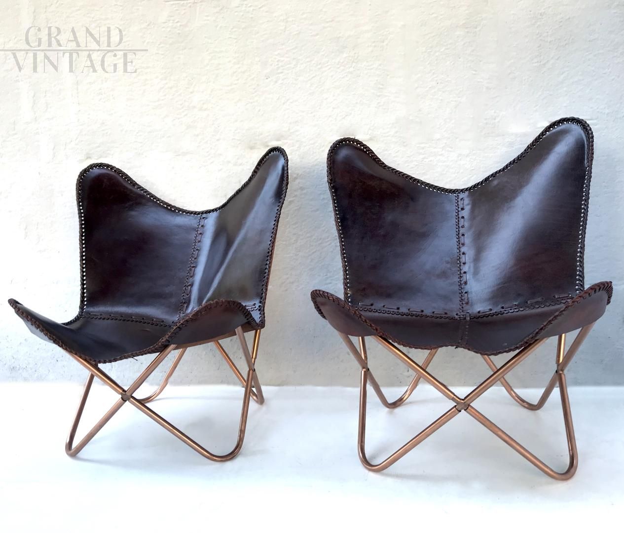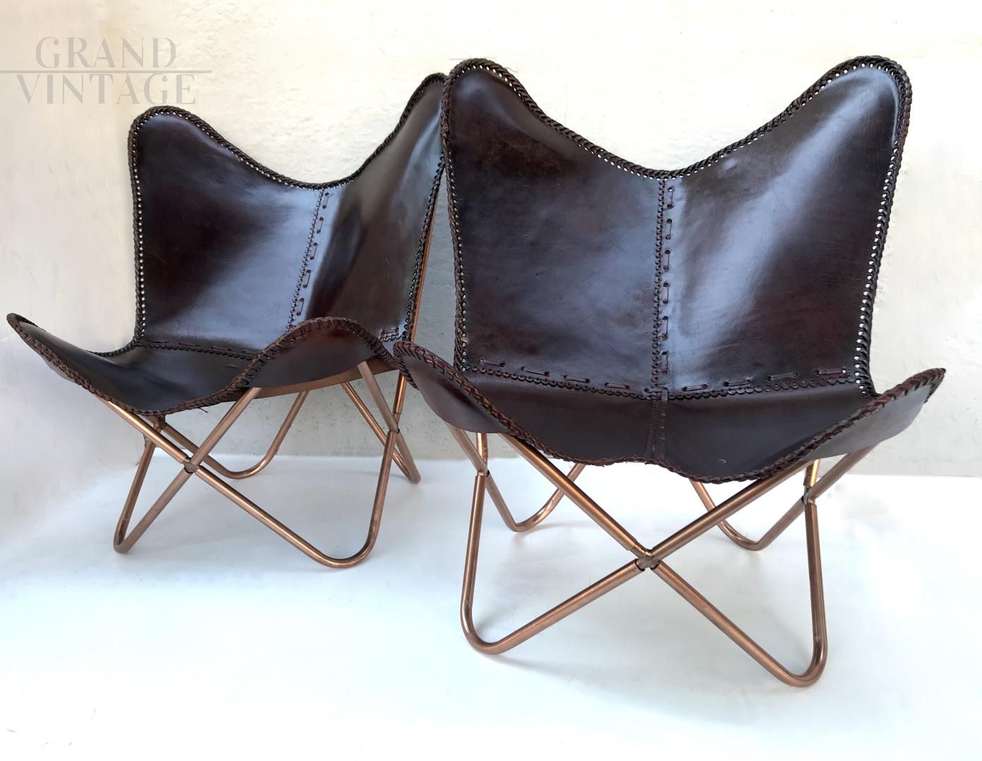 Butterfly armchairs in dark brown leather with copper metal legs, a contemporary production in a vintage style.
