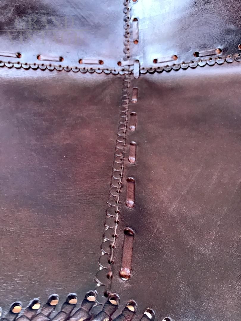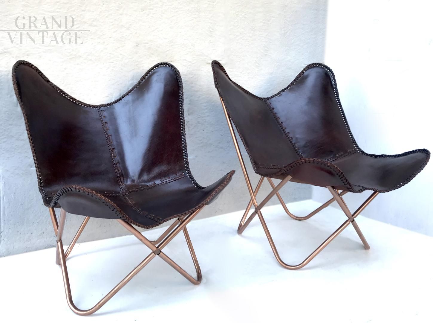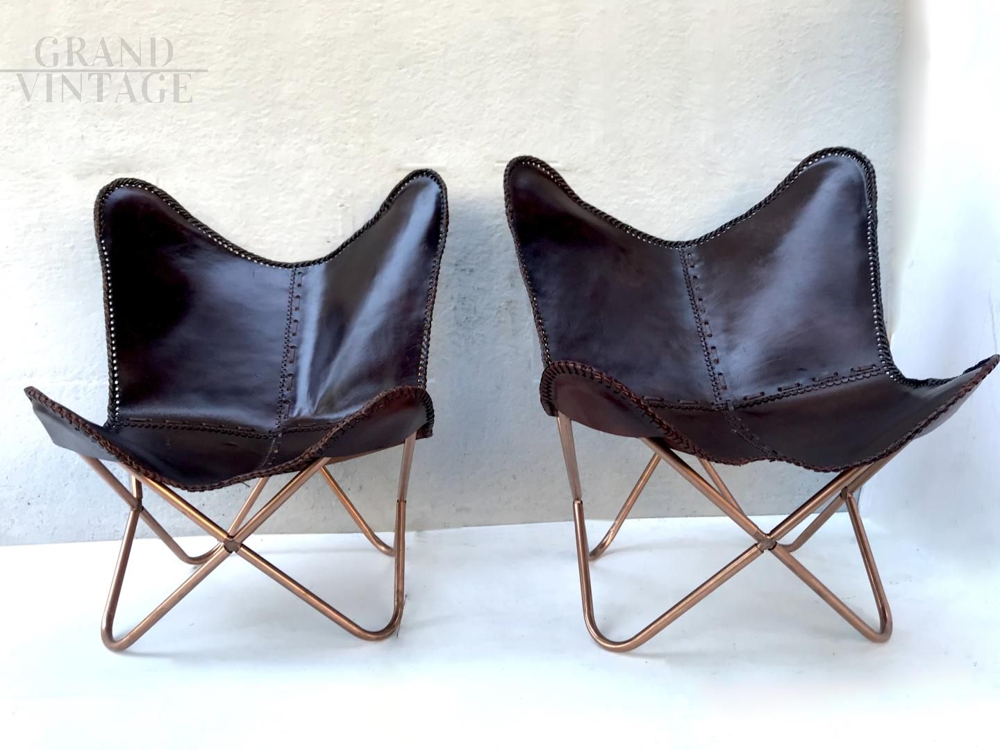 Butterfly armchairs in dark brown leather with copper metal legs, a contemporary production in a vintage style.