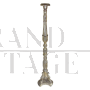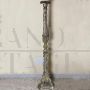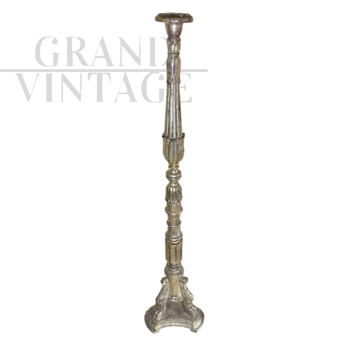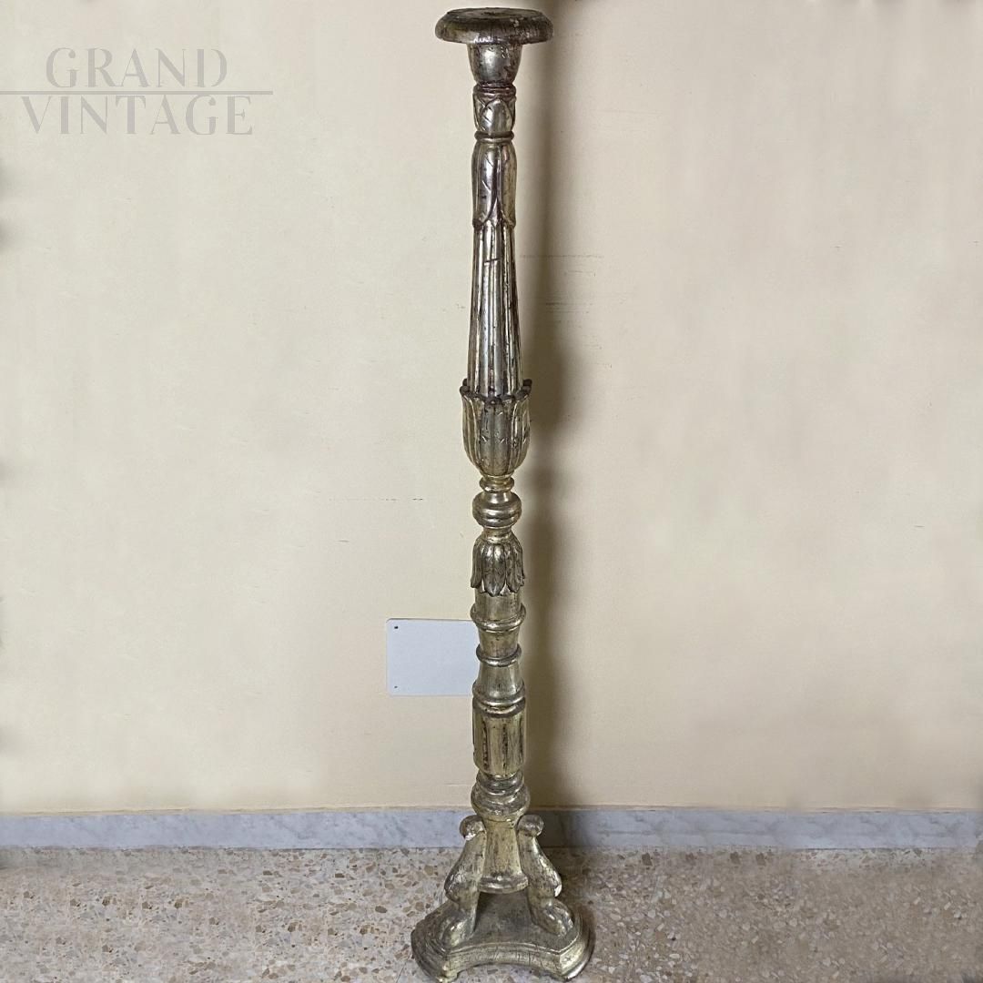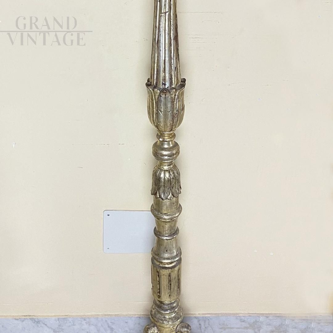 Antique wooden torch holder / candlestick entirely carved with floral and naturalistic motifs, in original silver leaf, belonging to the XVIII century.