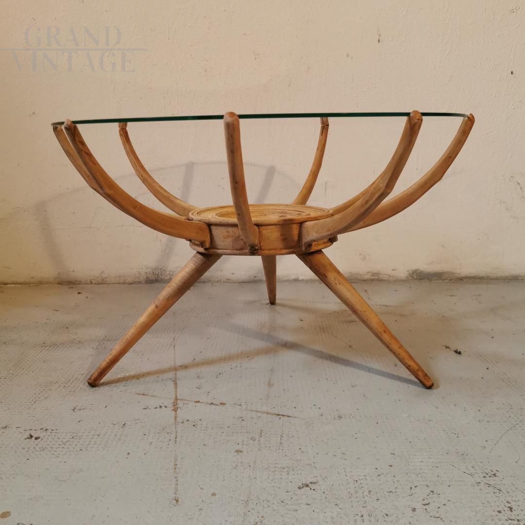 Vintage spider model coffee table by Carlo de Carli, in beech wood and crystal.
