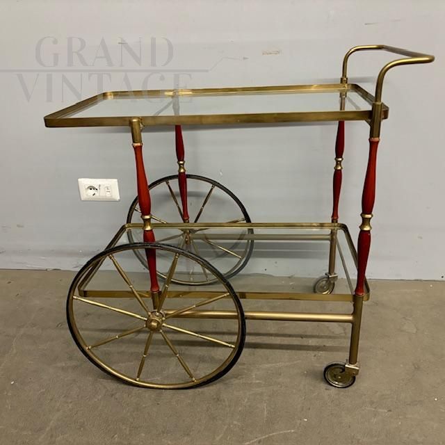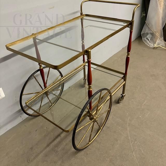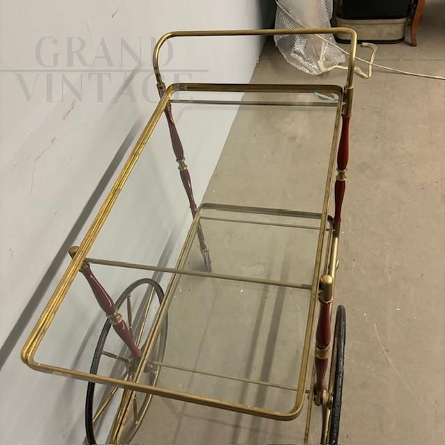 Vintage serving trolley designed by Cesare Lacca in brass and burgundy lacquered wood, with two glass tops, Italian mid-century modern design from the 50s. All original, shows slight wear, the glass shelves are intact and original from the period.